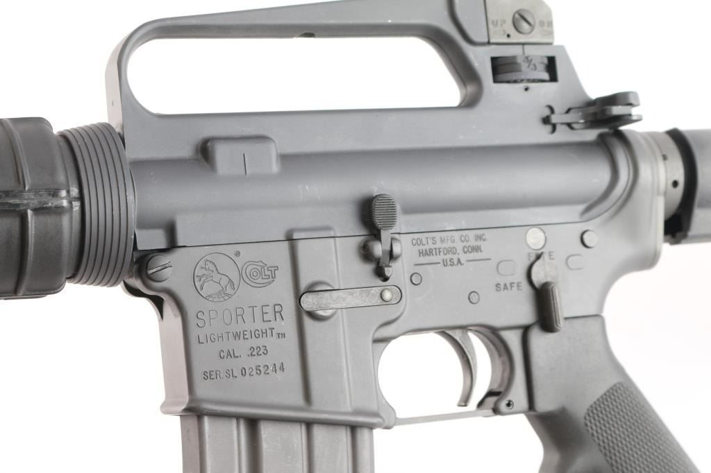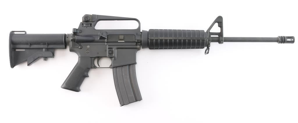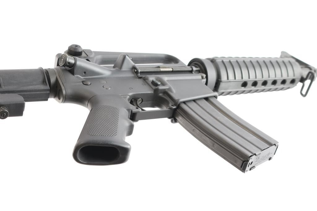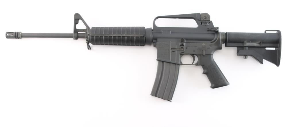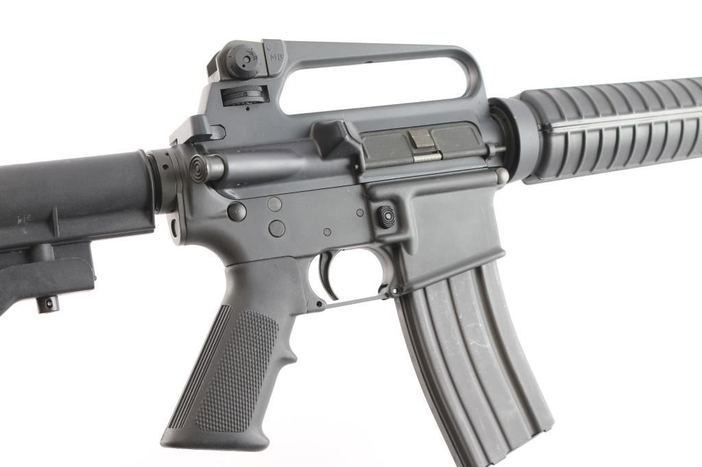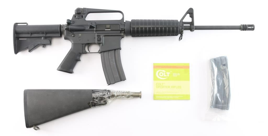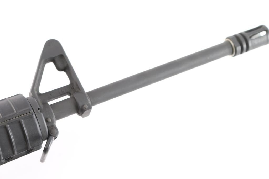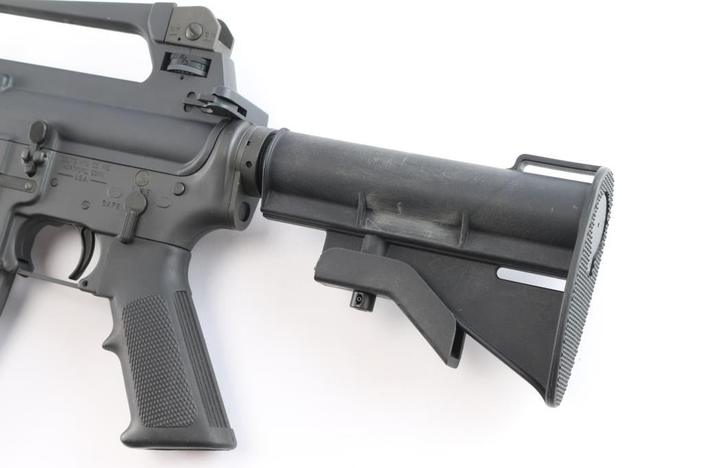 AR15 style semiautomatic rifle. Features dark parkerized metal, chrome lined 16" lightweight barrel with 1:7 twist rifling, 5 flute flash hider, triangular front sight base with bayonet lug, protected post front sight, adjustable peep rear sight in A2 style fixed carry handle upper receiver, forward assist, ejection port cover, shell deflector on upper receiver, A2 style pistol grip, 4 position collapsing carbine stock, round handguards with heat shields. Has Colt style half moon bolt carrier, larger trigger & hammer pins, two piece carpenter screw type front pivot pin. Overall excellent condition with handling marks, some scuffing along barrel. Polymer stocks are excellent. Includes two Colt marked 30 round magazines (one in gun, another new in wrapper), manual, fixed A2 style stock with spring/buffer & cleaning kit in butt trap.