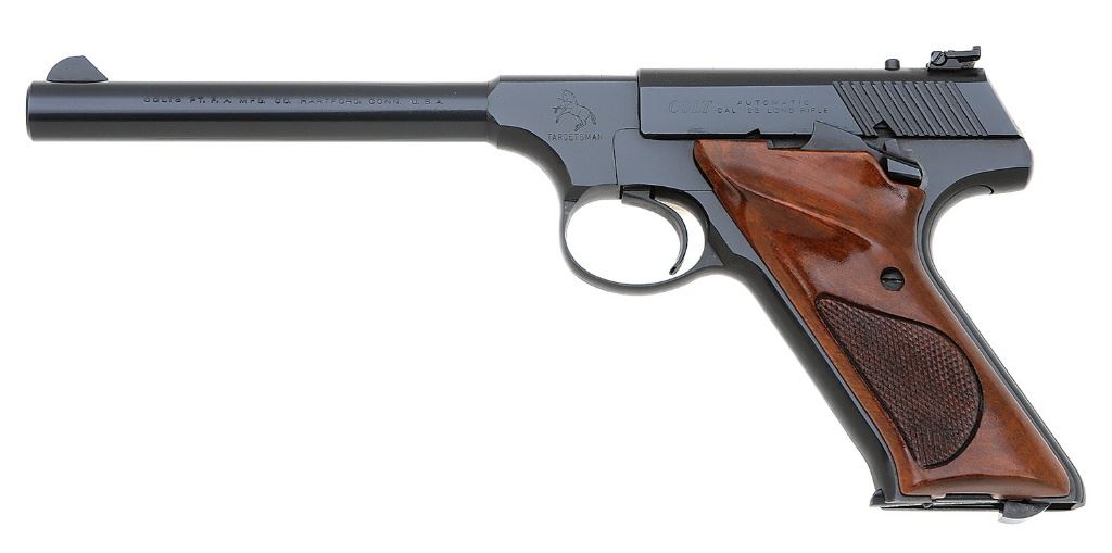 serial #026024S, 22 LR, 6'' barrel with an excellent bore. This lovely pistol remains in virtually new condition showing little if any use. The metal surfaces retain about 99% original blue with minor handling marks. The checkered walnut factory thumb rest grips rate excellent. This gun features a serrated ramp front sight, adjustable rear sight, combination safety and manual slide lock, and heel-style magazine catch of the Third Series Woodsman. It includes the original woodgrain factory box that is correctly end labeled and numbered to the gun, ten-round factory marked magazine, test target numbered to the gun and dated July 17, 1971, and paperwork. The box rates about very good plus with light edge and corner wear, and one corner on the lower part of the box is torn. A lovely Targetsman. (8A11770-16) {C&R}. (1000/1500)