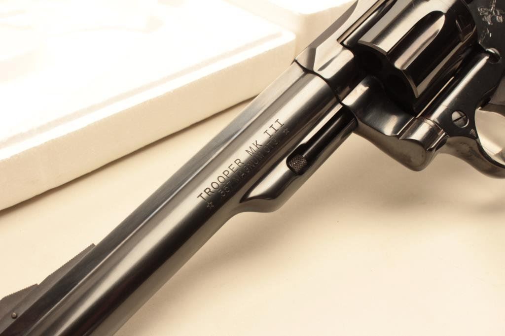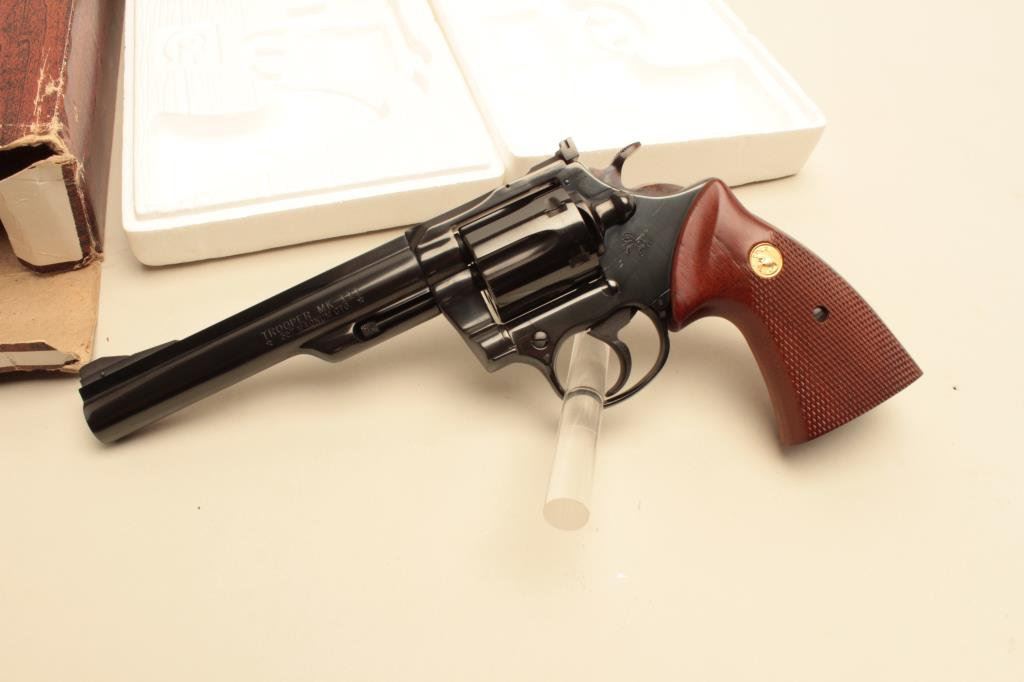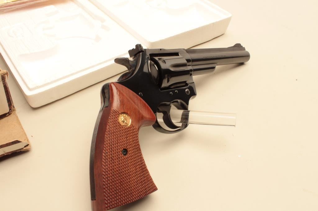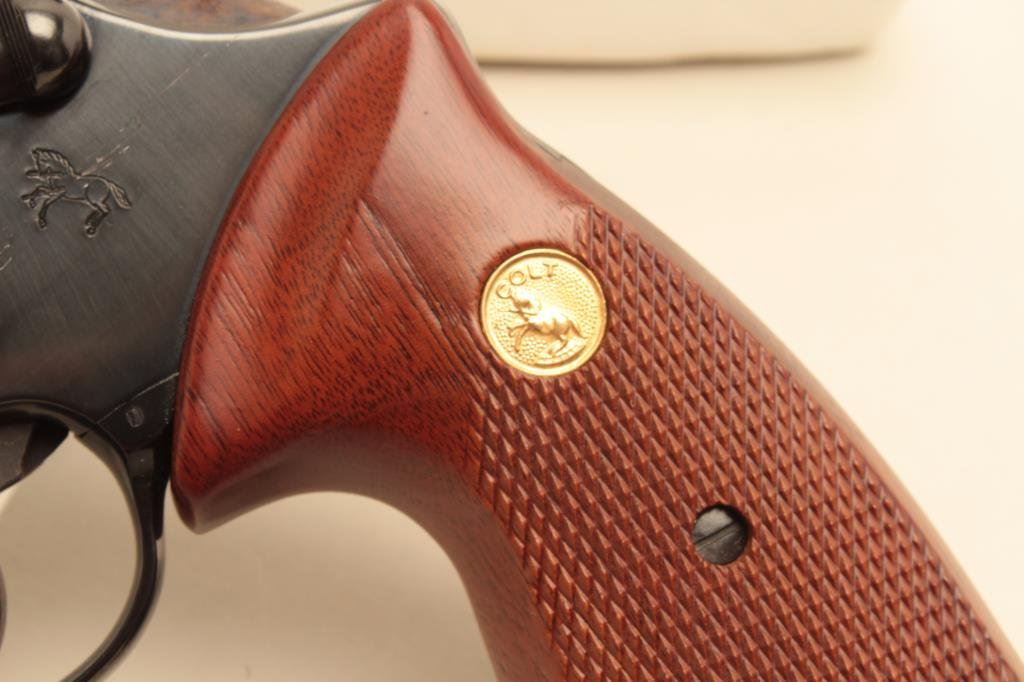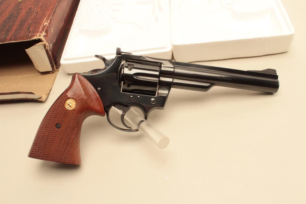 The pistol is as new in the original box with a 6” barrel. The barrel retains nearly all of its blue finish with a ramp front and adjustable rear sights. The cylinder shows a faint drag line, while the hammer displays beautiful case hardening. The checkered gold medallion grips are in excellent condition with sharp checkering. The bore is very good, the markings are sharp and action is crisp. The pistol comes in the factory woodgrain cardboard box which shows wear with some tattering at the ends and includes all associated packing material and literature. Est.: $600-$1,200. (Modern).
