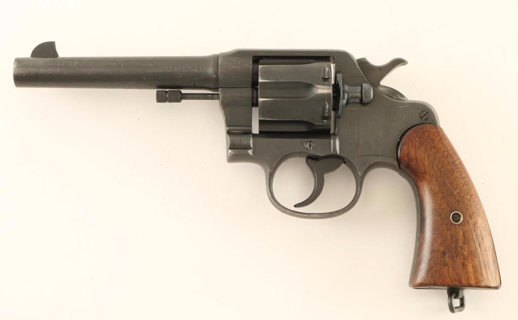 Finely refinished U.S. Military double-action service revolver chambered in .45 Automatic, circa 1919. Features a blued refinish, 5.5" barrel, blade front sight, "u" notched rear sight, fluted six-shot cylinder, non-shrouded ejector rod, smooth trigger, checkered hammer spur, lanyard ring, and two-piece smooth walnut grips. Markings: Frame - Rampant Colt, "U.S./ARMY/MODEL/1917" & "No/77/721". Barrel - "UNITED STATES PROPERTY", "COLT'S PT FA. MFG. CO. HARTFORD CT U.S.A./PATD AUG 5.1884 JUNE 5 1900 JULY 4 1905", "COLT D.A.45" & "10955". Revolver exhibits approximately 91% of it's old blued refinish showing some holster wear, scattered handling marks. and a faint drag line on the cylinder. Action is crisp with solid lock-up, bore is very good, markings are good and wood grips are very good. Condition is very good+ as refinished. ***C&R Firearm*** ***Modern Firearm***