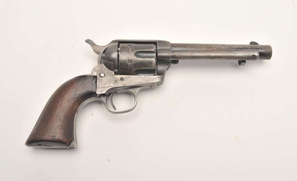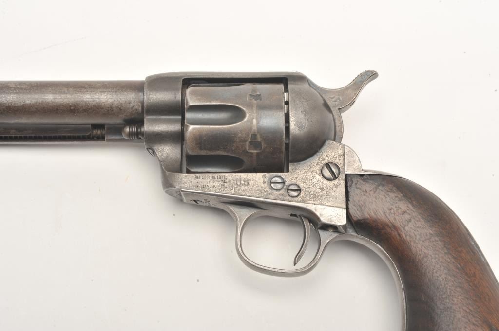 Colt U.S. Artillery Model SAA revolver, .45 caliber, 5.5” barrel, blued finish, smooth wood grips, S/N 114372 (frame number; 140247 trigger guard and backstrap), in overall good to very good condition displaying scatteredareas of original finish on cylinder, trigger guard and ejector housing, crisp action, good markings and good bore; grips are good overall with no visible inspector cartouches. Accompanied by a Colt factory letterindicating sale to U.S. Government Inspector at the Colt plant on January 21, 1885, one hundred guns in order. (Antique). Est.: $2,500-$5,000.