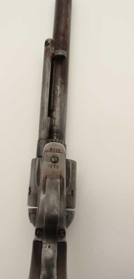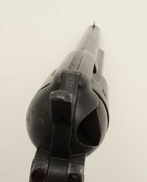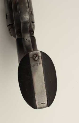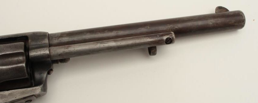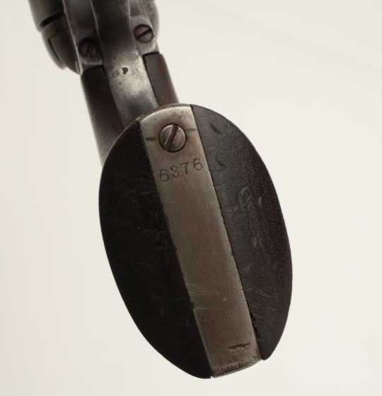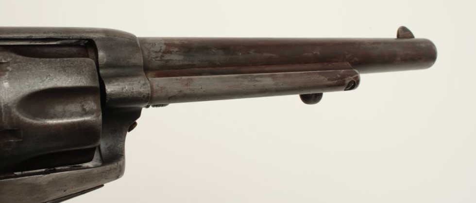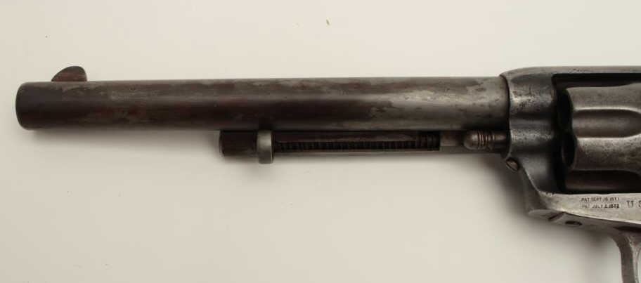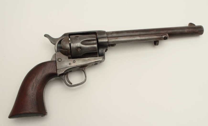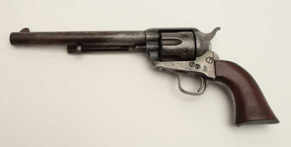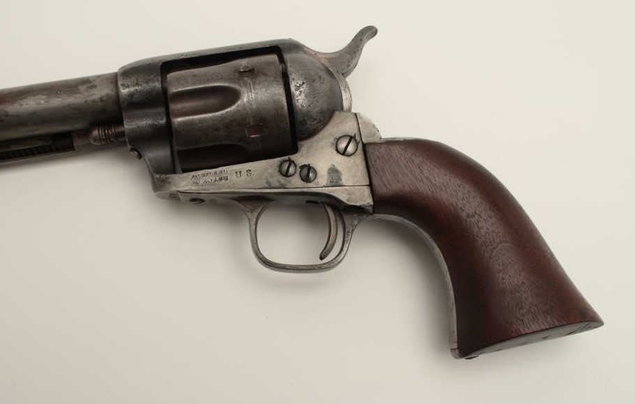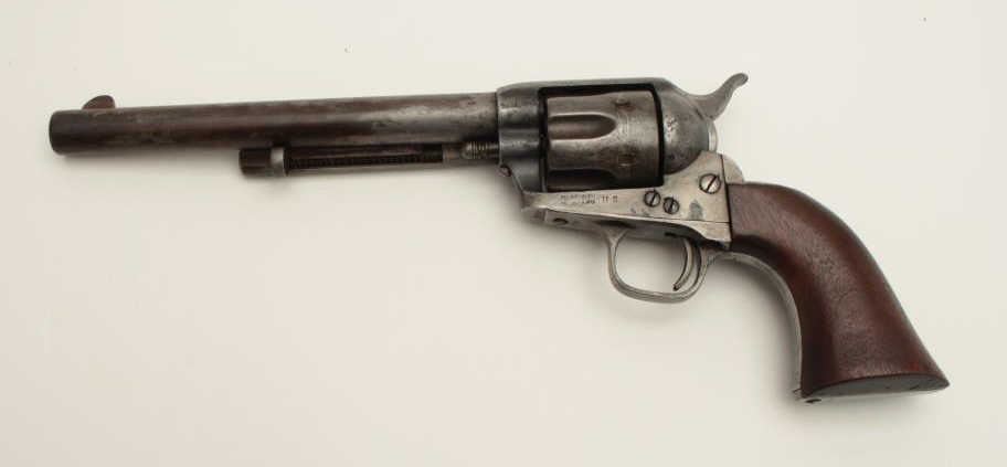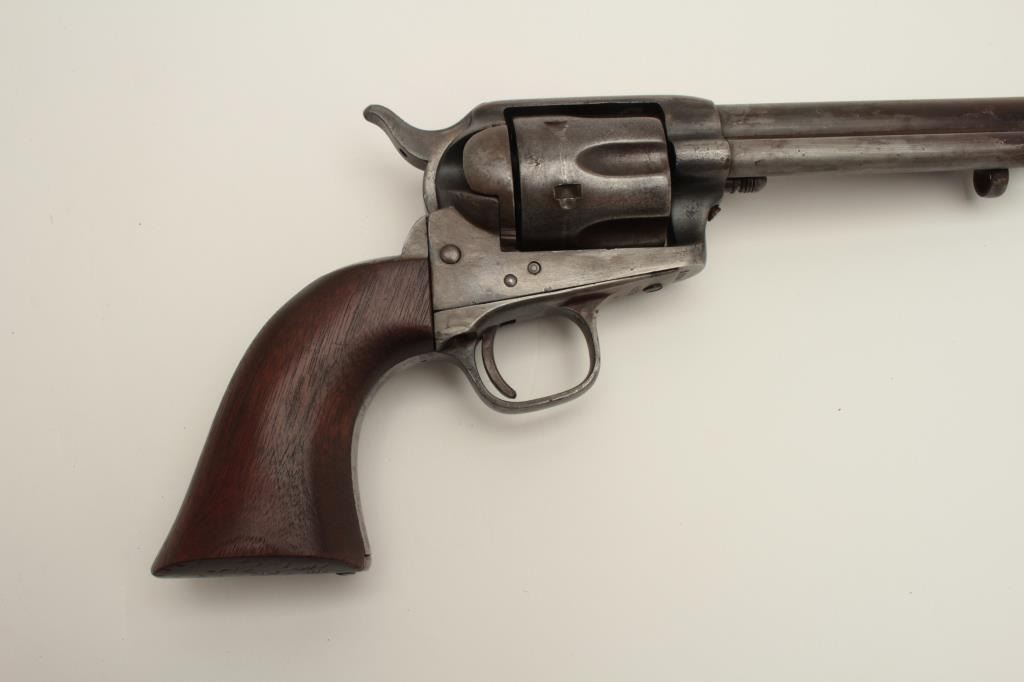 Colt U.S. Artillery Model Single Action Army revolver, .45 caliber, 7.5” barrel, wood grips, S/N 6376, in overall good condition with grey patina and browning on front areas of the barrel, crisp action, sharp markingsincluding italicized barrel address, wood grips are very good with no visible inspector’s cartouches; may be replacements. (Antique). Est.: $2,500-$5,000.