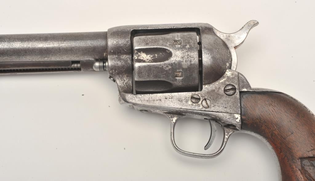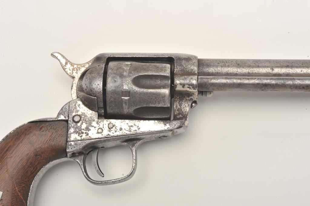 Colt U.S. Cavalry Model SAA revolver, .45 caliber, barrel reduced to 5.5”, nickel finish, Ainsworth inspected and barrel with italicized address, wood grips, S/N 12119, in overall good condition showing heavy darkpatina with scattered spots of erosion and pinprick pitting, some scattered areas of nickel that appear to have been from an old re-finish, strong action, dark bore, grips show an old rectangular inlay on right sideand space on left side where inlay is missing. (Antique). Est.: $1,750-$3,500.