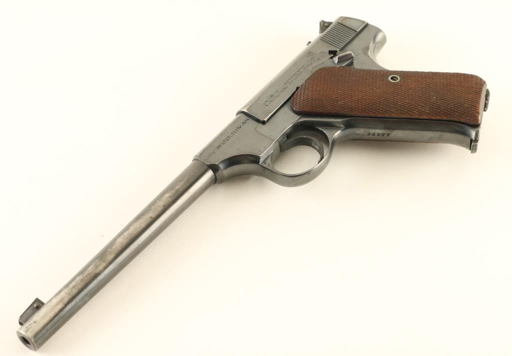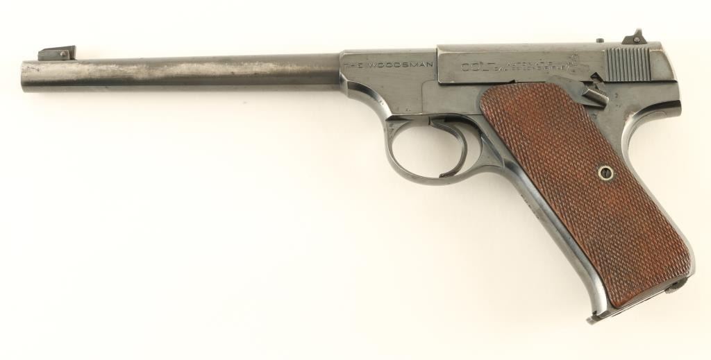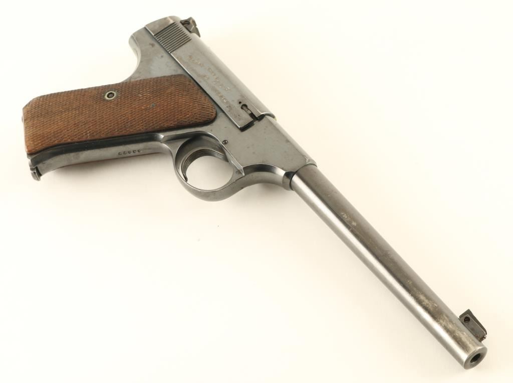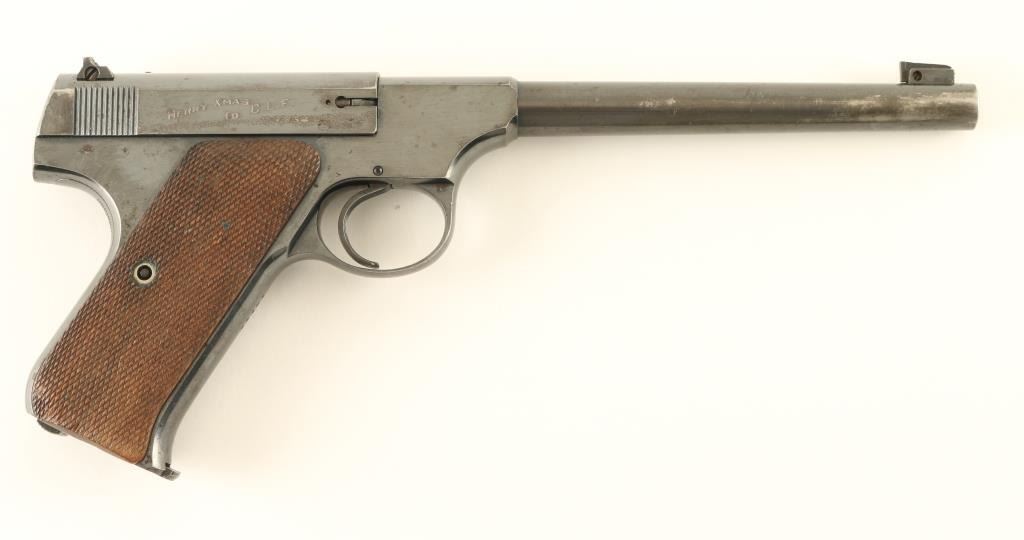 Semiautomatic rimfire pistol features 6.5" barrel, adjustable sights, manual safety, heel magazine release. Bore is very good condition. Retains 75% blue, with significant thinning and bare metal on the sides of the barrel, smaller areas of bare metal at high spots and sharp edges, thin line of patina on right side of slide. Checkered wood grips are very good condition, left panel is slightly loose. Right side of slide is engraved "MERRY XMAS TO CLF 1934". Includes one magazine. Condition is NRA Good *** C&R Firearm ***