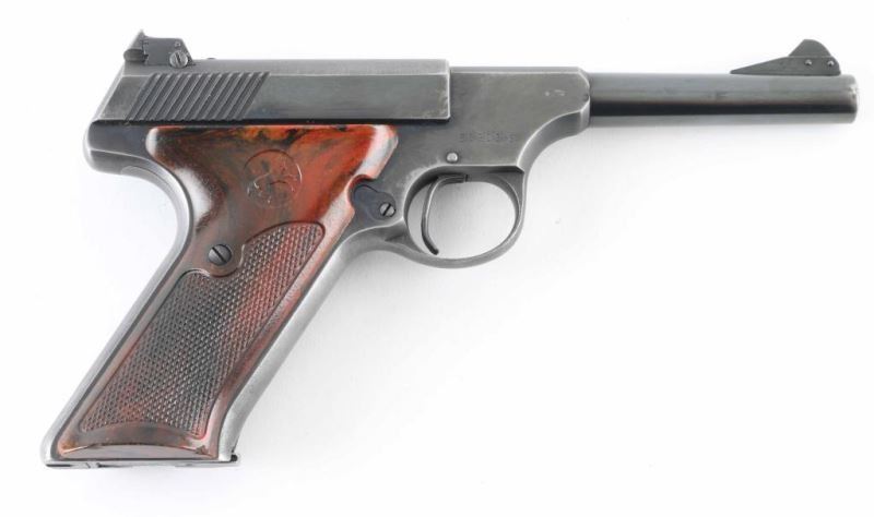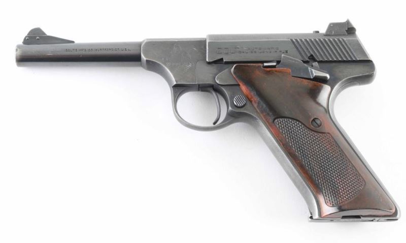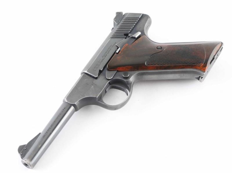 Semiautomatic rimfire pistol manufactured circa 1974. Features blued finish, checkered plastic grips with Colt logo, 4.5" barrel, adjustable sights, push button magazine release, manual safety, lanyard pin at butt. Bore is very good condition. Retains 80% blue, turning gray and thinning on slide & grip straps, bare metal on edges. Grips are very good condition. Includes (1) magazine. Condition is NRA Very Good+ *** Modern Firearm ***