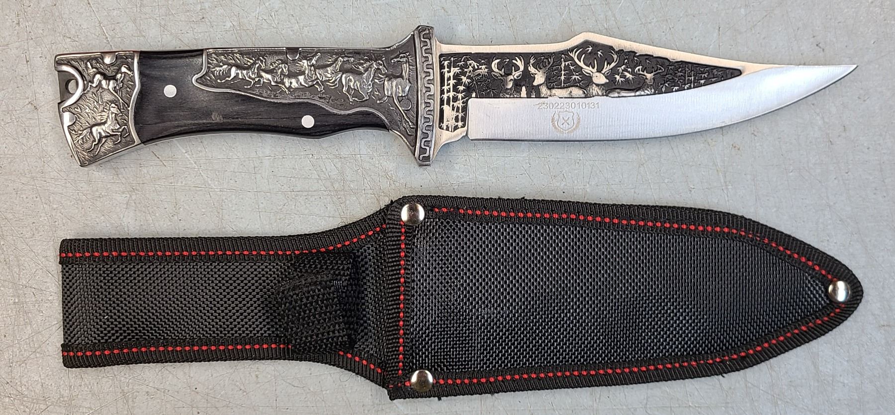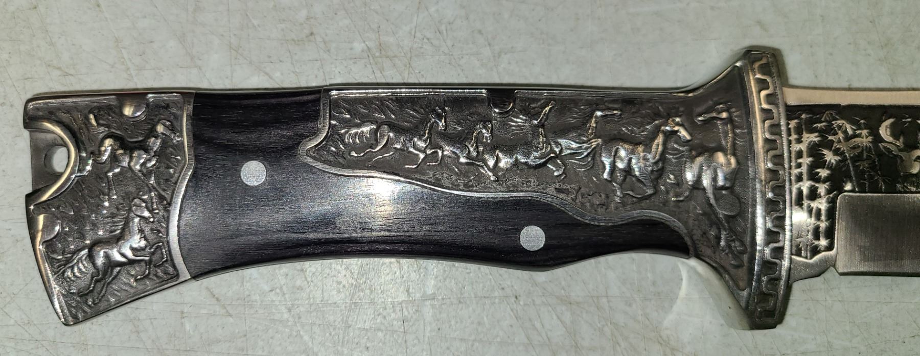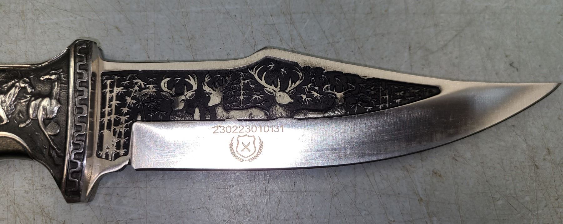 Blade is 5.75 in long. Nicely embossed with hunting scenes.