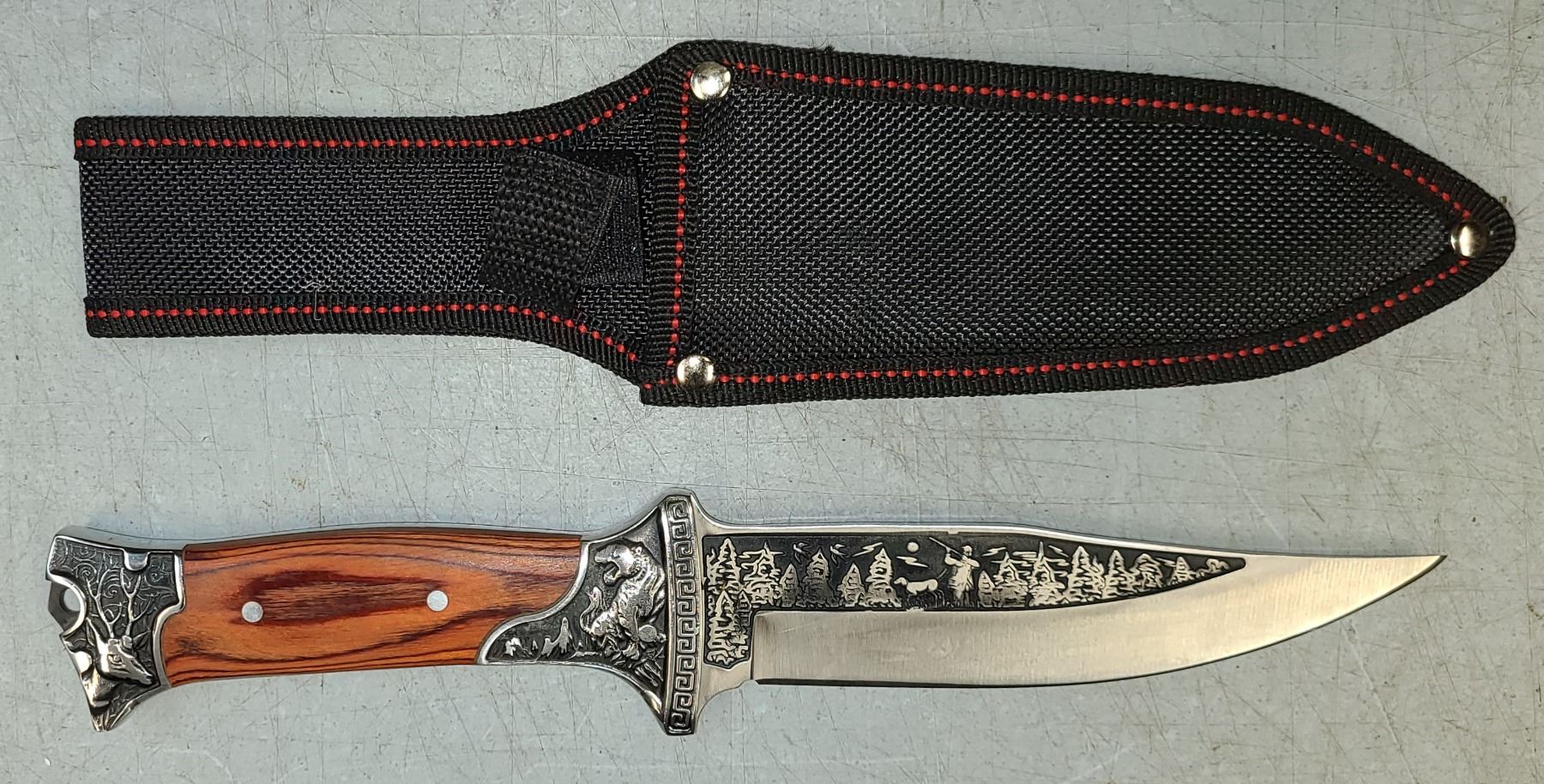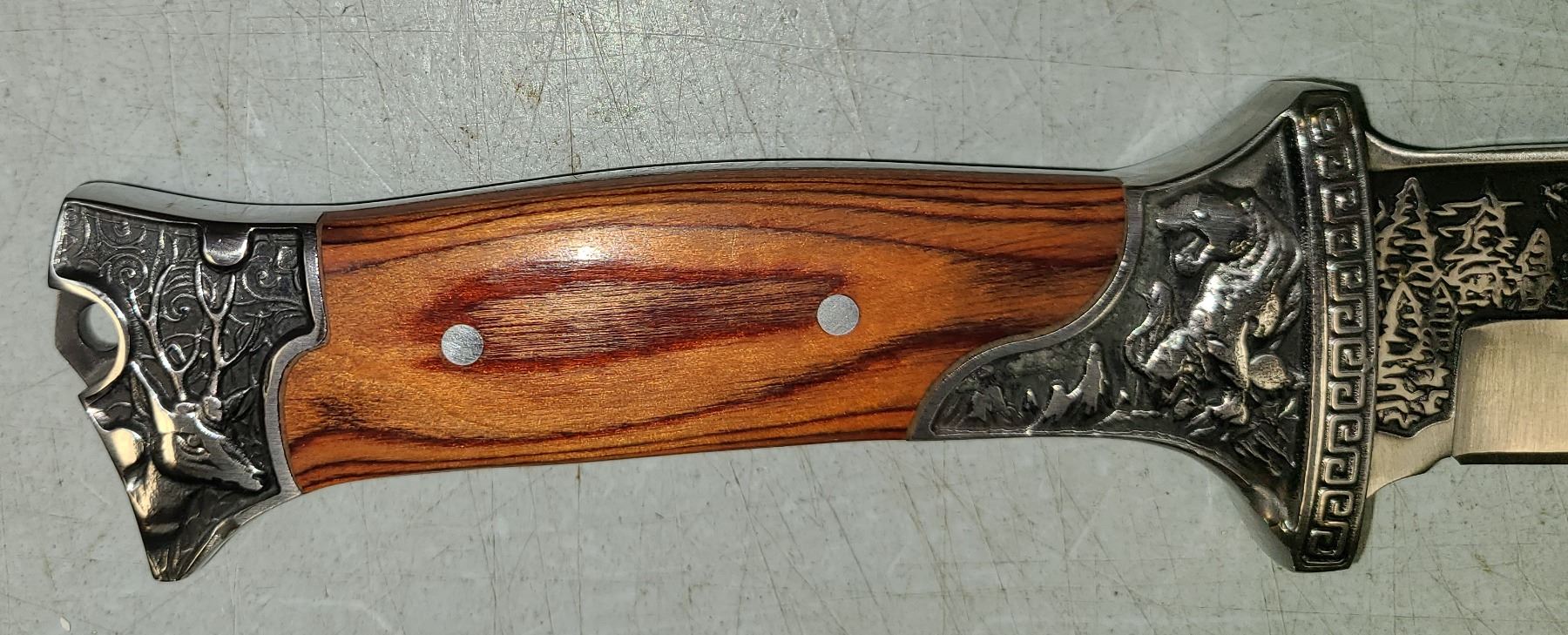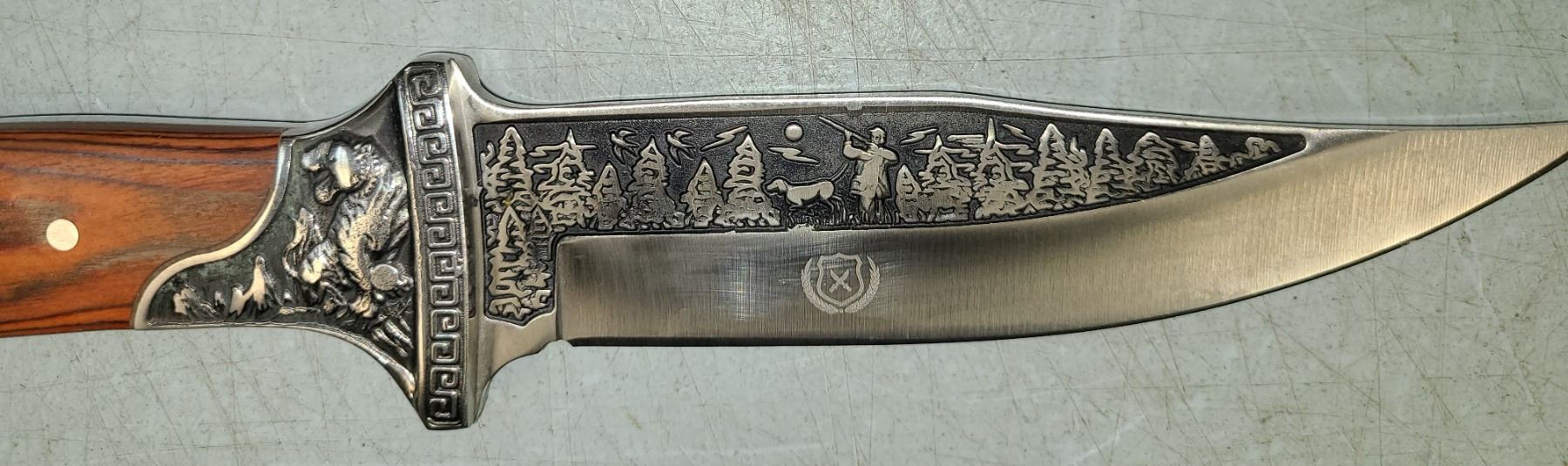 Blade is 5.75 in long. Nicely embossed with hunting scenes.