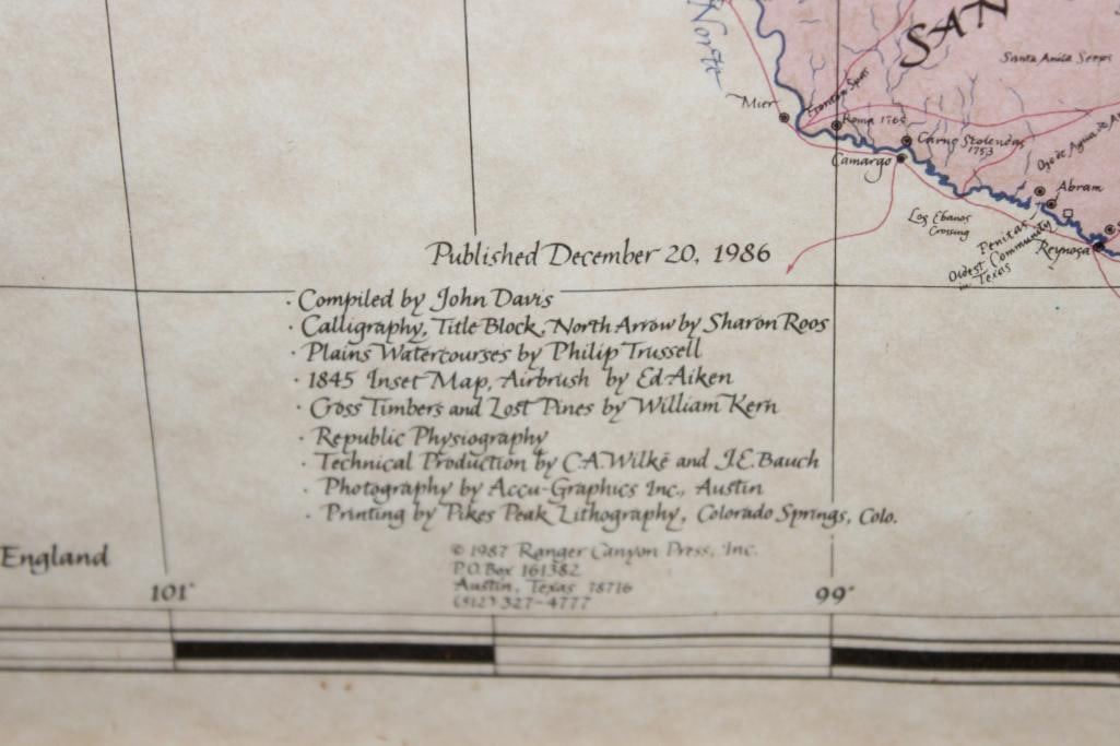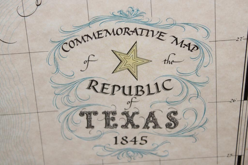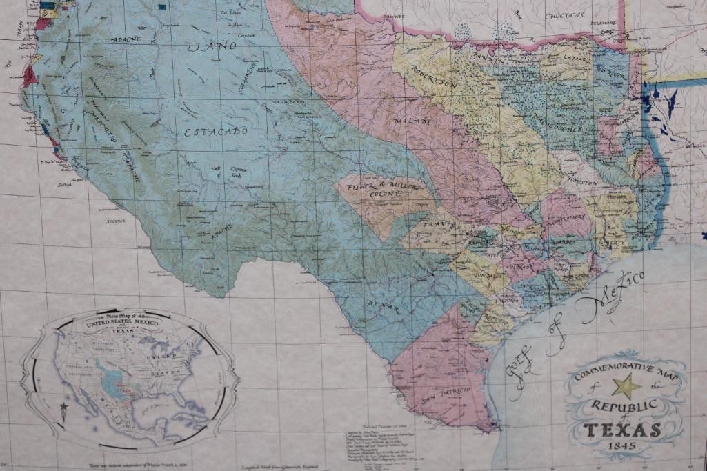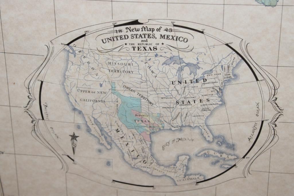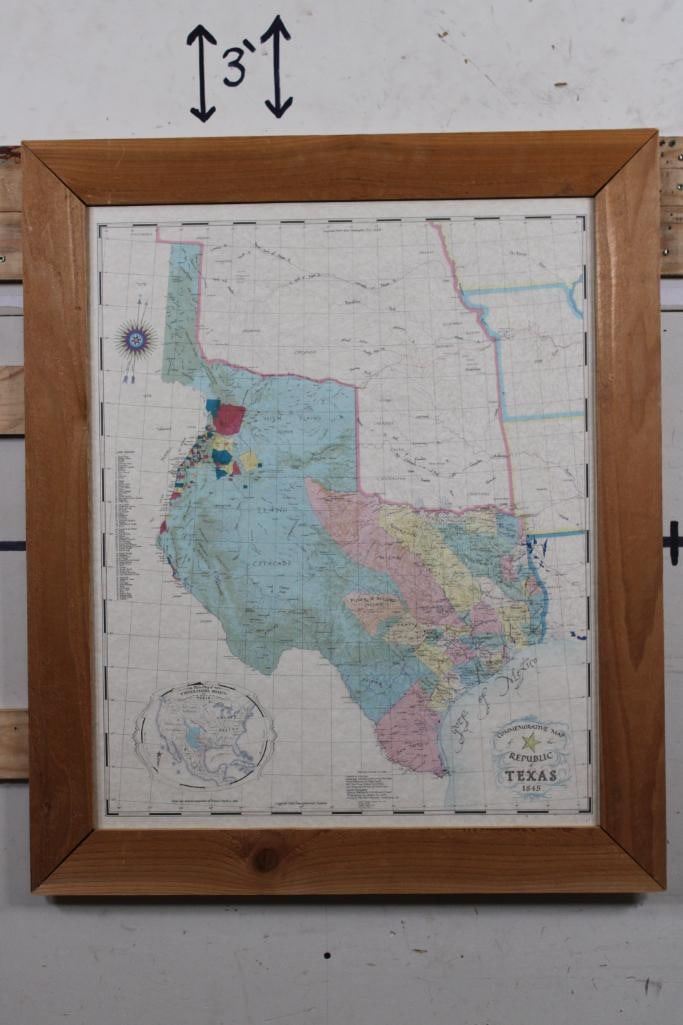 Commemorative MAP "The Republic of Texas-1845" from 1987. It is displayed in a 38.5" Tall x 32" Wide natural wood frame with glass. COLLECTIBLE MAPS