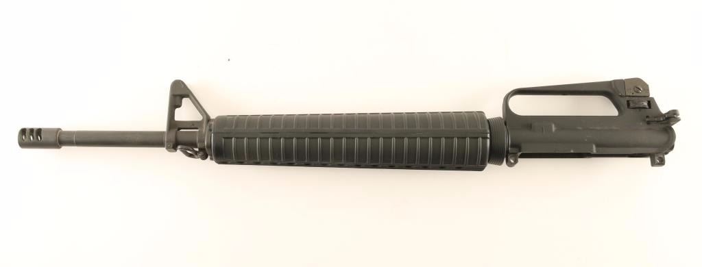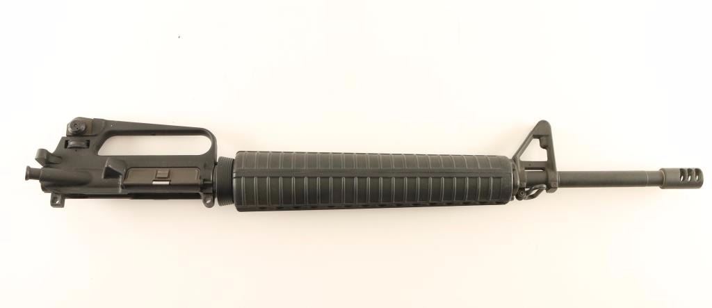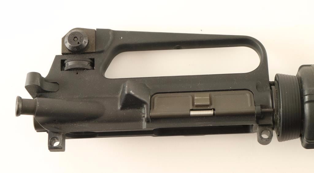 Unmarked upper that features a matte black finish, 20" semi-heavy barrel, muzzle break, A2 front sight without bayonet lug, rifle length black synthetic handguard, standard charging handle, AR-15 profile BCG, and carry handle upper with A2 adjustable dual aperture rear sight, dust cover, shell deflector & forward assist. Condition is good.