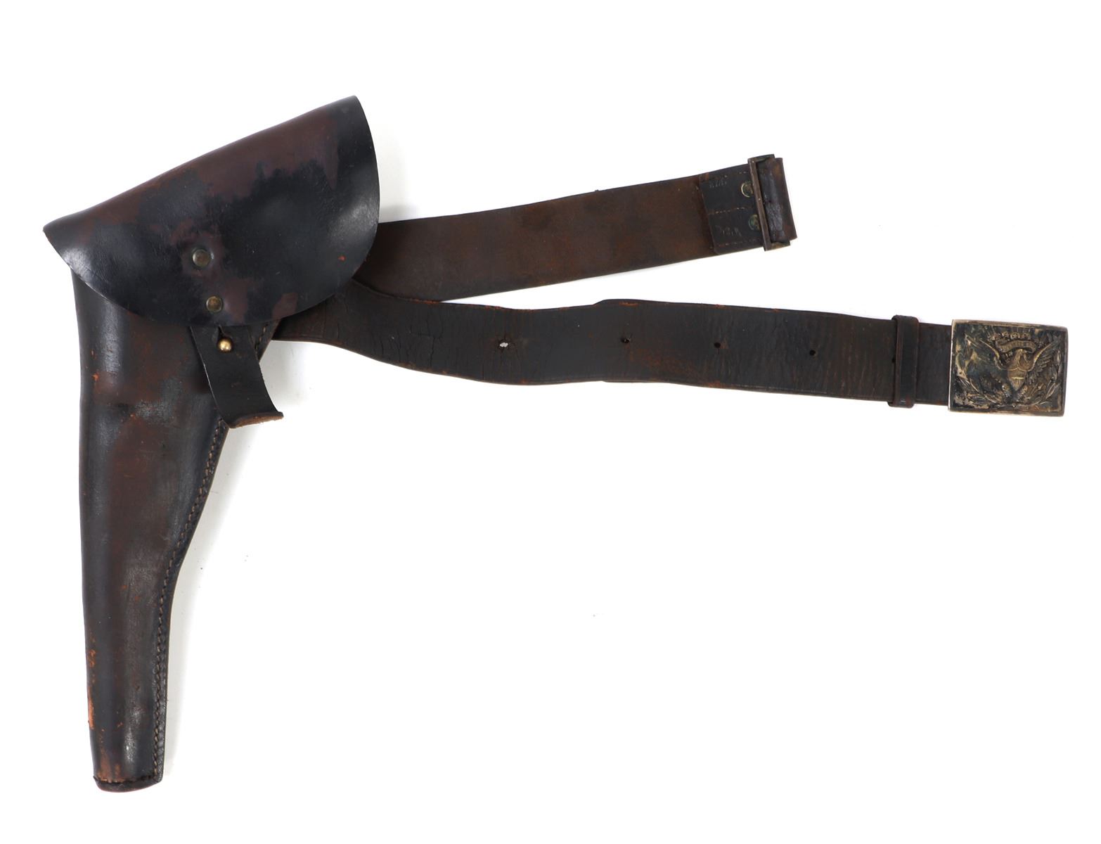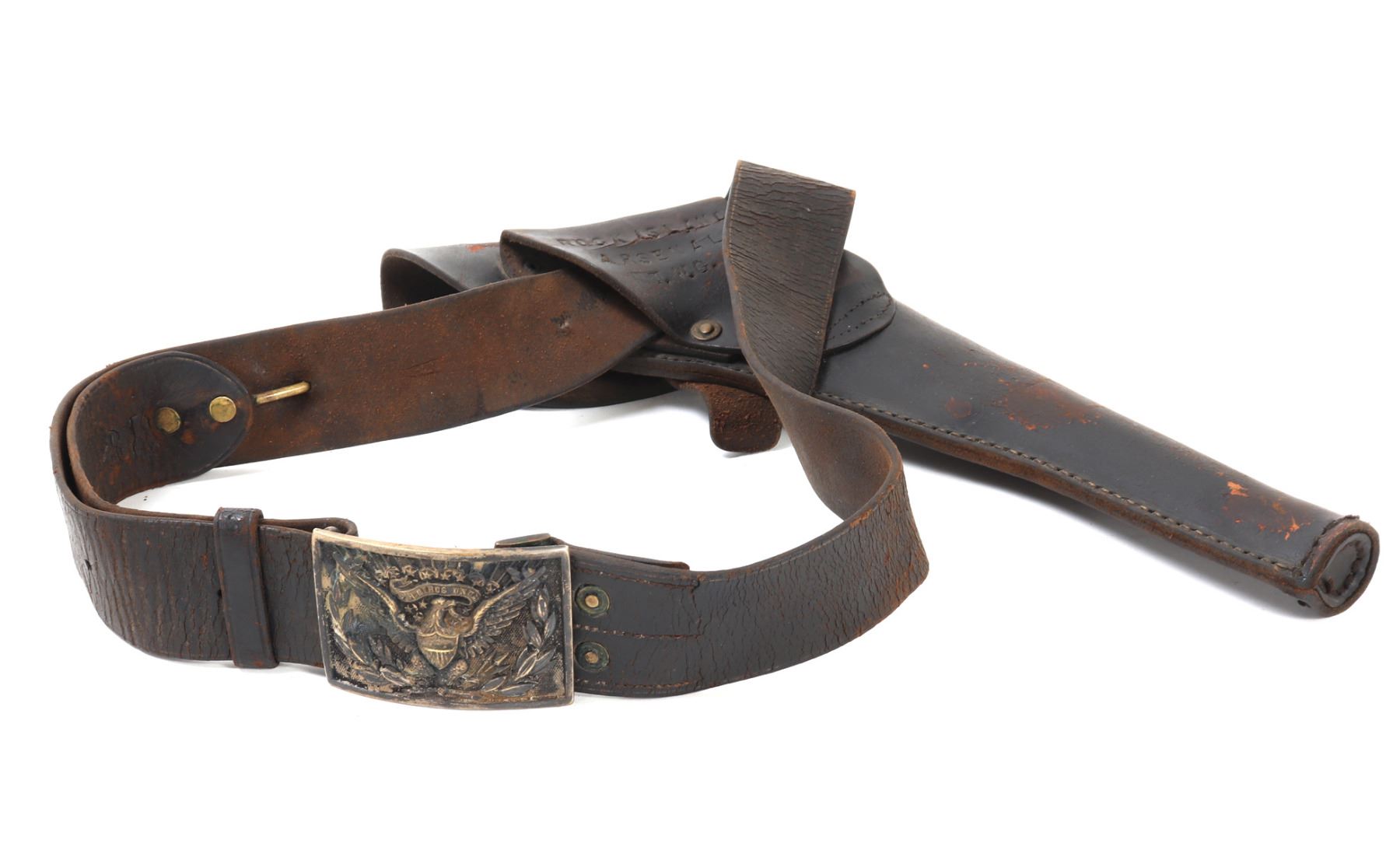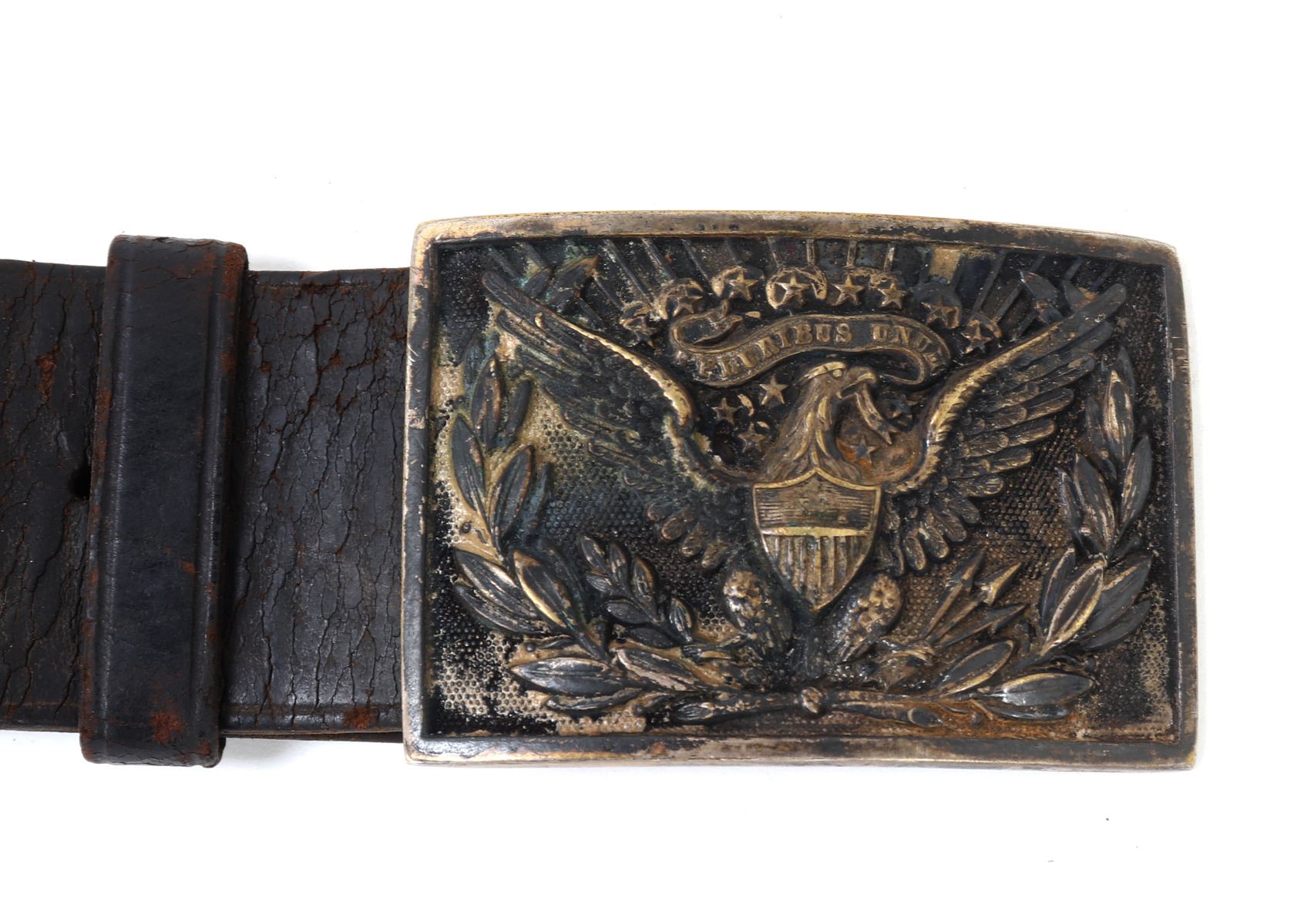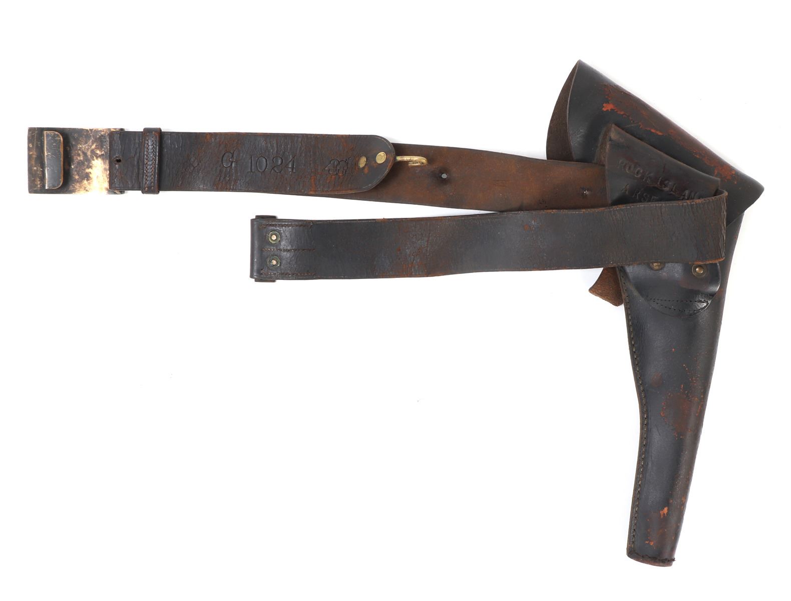 Great complete set of Civil War accessories including an original belt, pistol holster, and American Eagle buckle. Belt reading to the reverse (G1024, 3GB) & (ROCK ISLAND ARSENAL T.W.G.). Buckle in brass with the American eagle wings spread and the Latin inscription reading (E. Pluribus Unum). Size Holster 15" L, Belt 36" L. Condition: Typical wear from age and use with cracking and oxidization.. Provenance: Ex-Southern California Militaria Collection