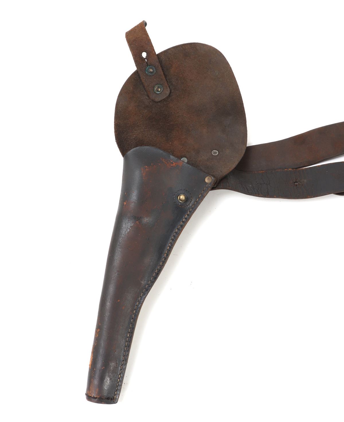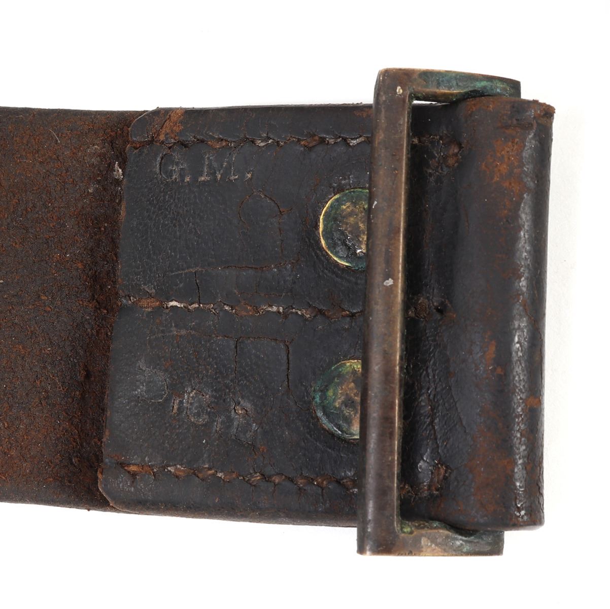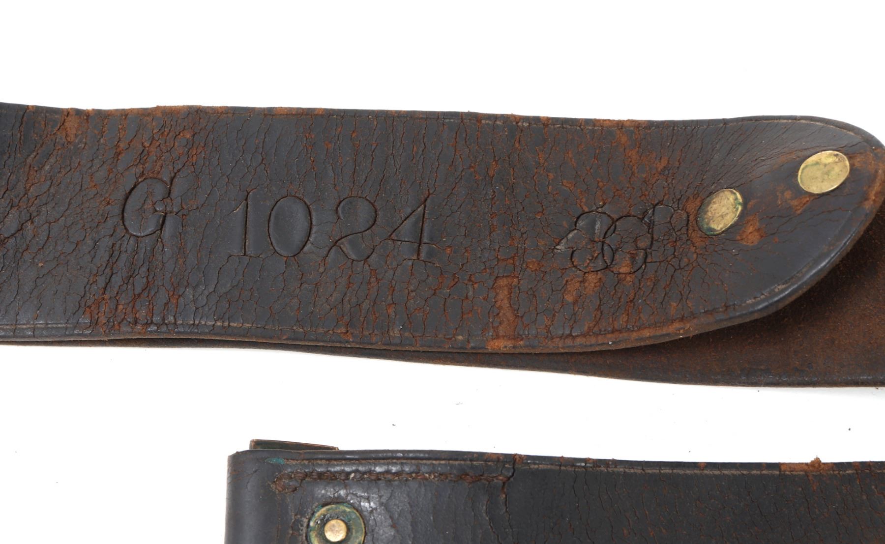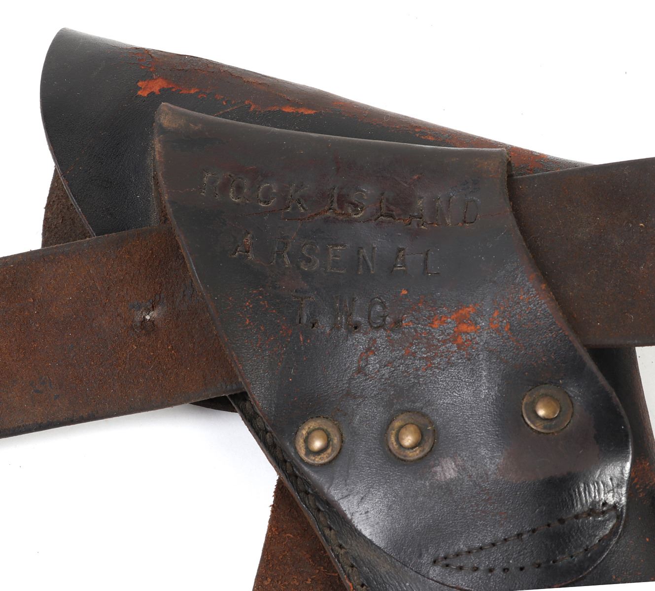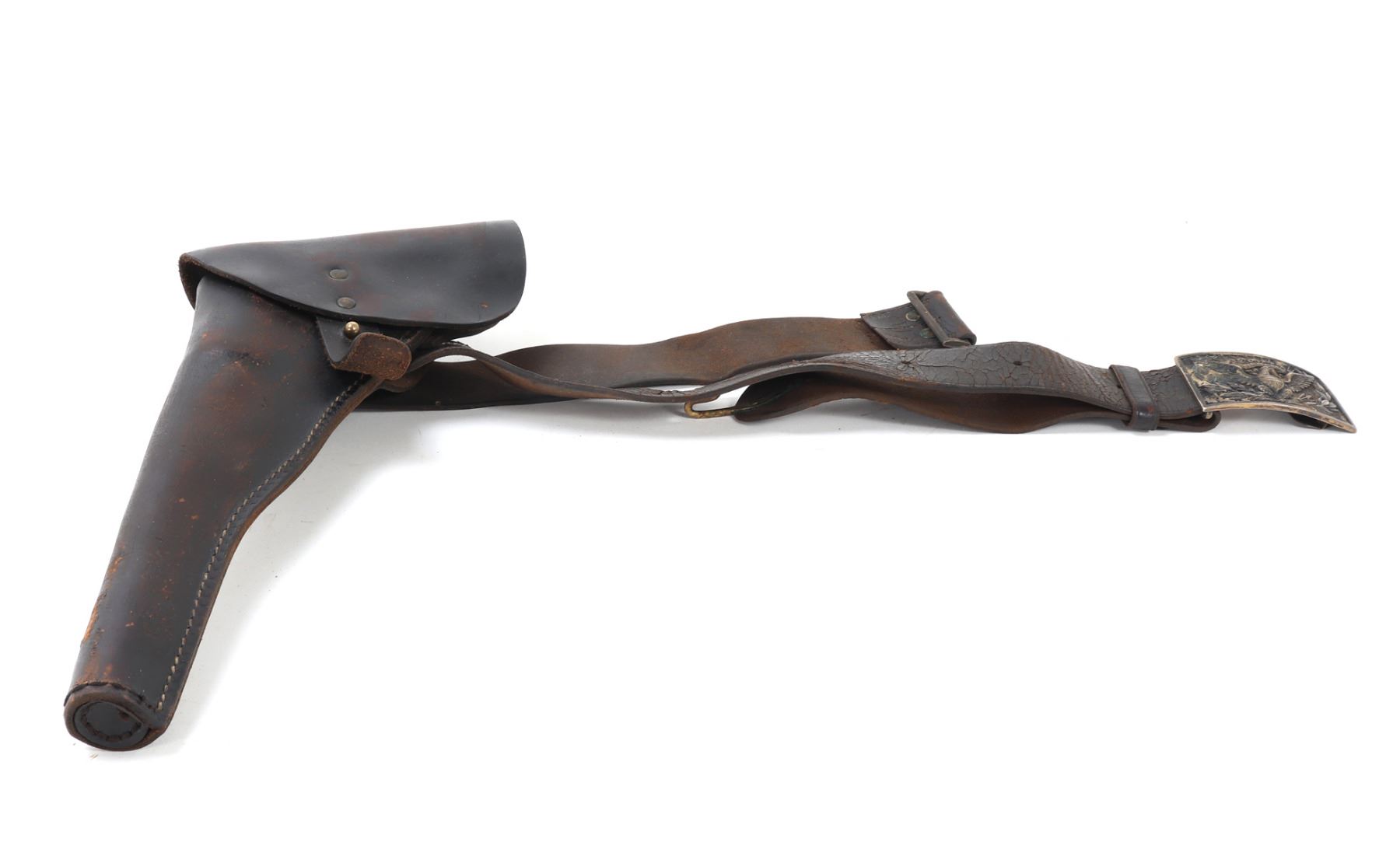Great complete set of Civil War accessories including an original belt, pistol holster, and American Eagle buckle. Belt reading to the reverse (G1024, 3GB) & (ROCK ISLAND ARSENAL T.W.G.). Buckle in brass with the American eagle wings spread and the Latin inscription reading (E. Pluribus Unum). Size Holster 15" L, Belt 36" L. Condition: Typical wear from age and use with cracking and oxidization.. Provenance: Ex-Southern California Militaria Collection