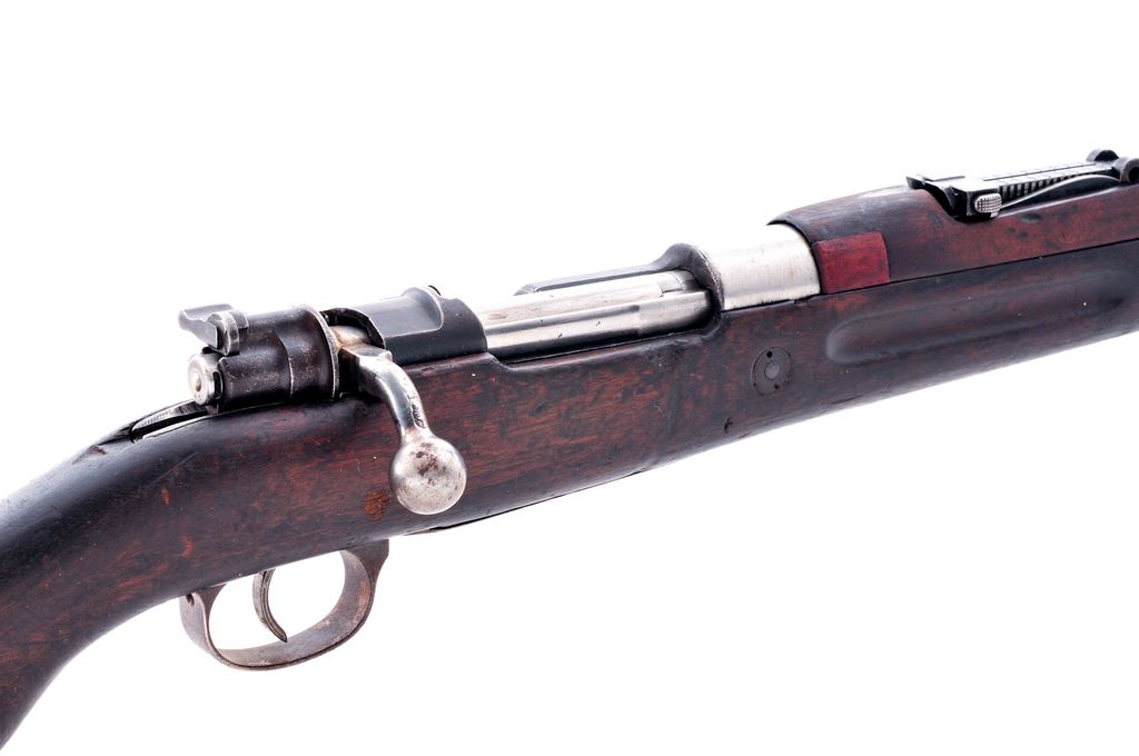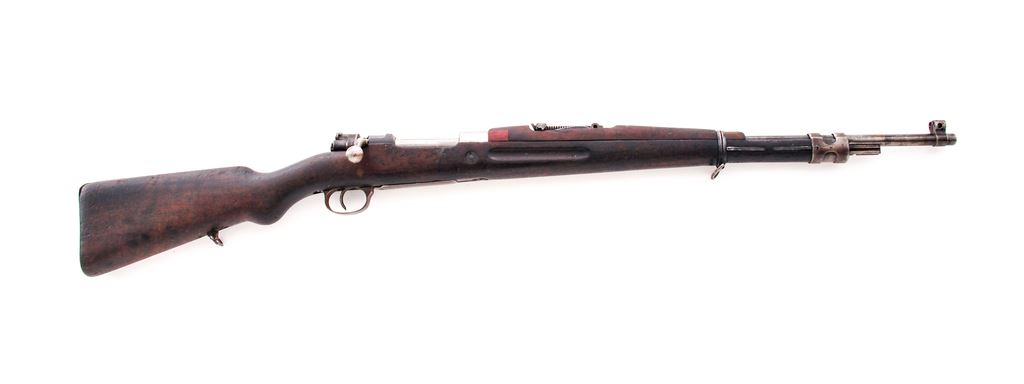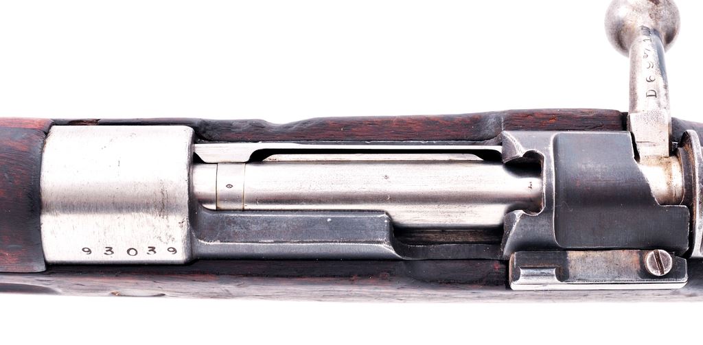 Composite Model 98 Mauser Bolt Action Rifle, #93039, 8x57mm cal., 23.6'' barrel, blued finish, hardwood stock, inverted ''V'' front sight with protectors and adjustable tangent rear sight. Serial number only on receiver, no other markings. Mismatched number on bolt handle and left side of buttstock. Missing cleaning rod and front triggerguard locking screw. Bolt handle has been partially turned down. Condition overall is very good with markings removed from the receiver ring, which has been left bright and showing a partial refinish to the left side receiver rail, otherwise about 40% finish remains on metal surfaces. Old pitting is visible at the wood line near the rear band. Handguard has an inletted piece of wood glued into the right rear side as a repair. Wood has darkened and shows overall old handling marks. Action is smooth, bore is bright with good rifling. Should be checked by a gunsmith as the safety is jammed in the ''Fire'' position. No visible import stamps. Est.: $150-$250. (C&R)