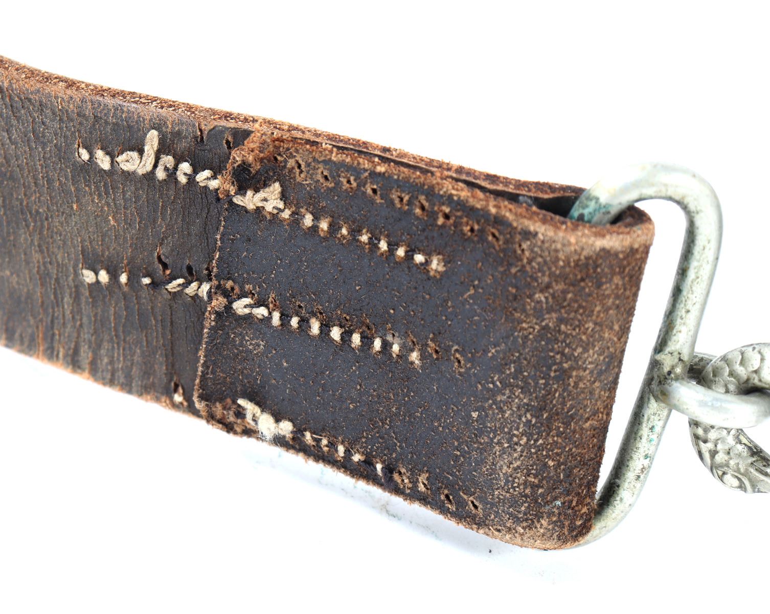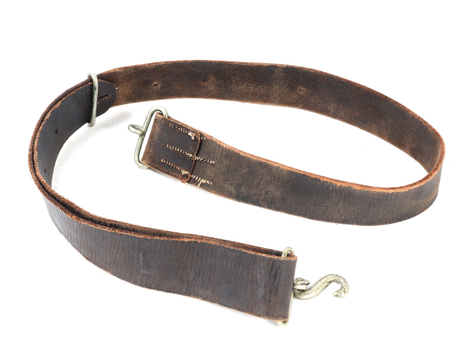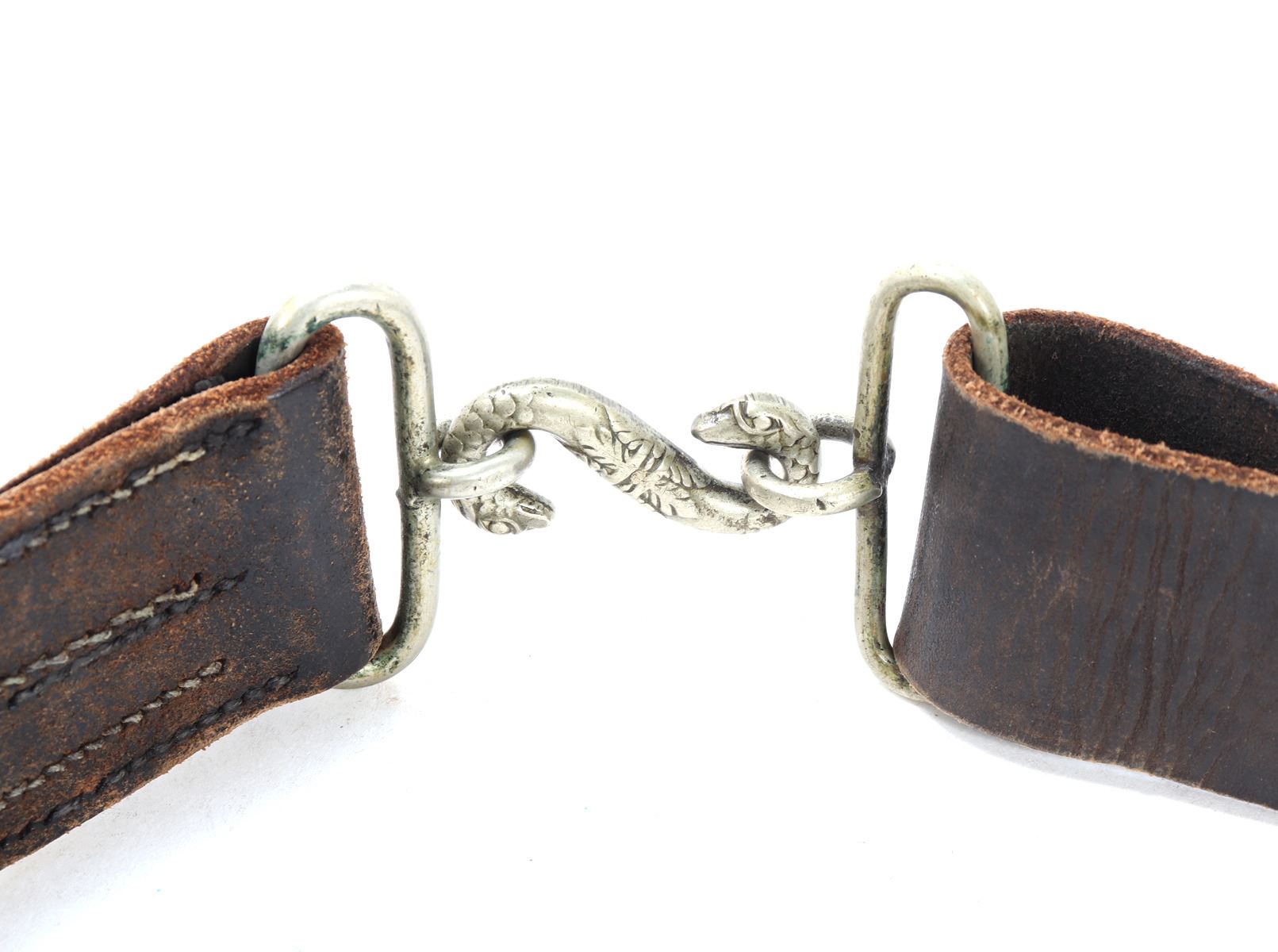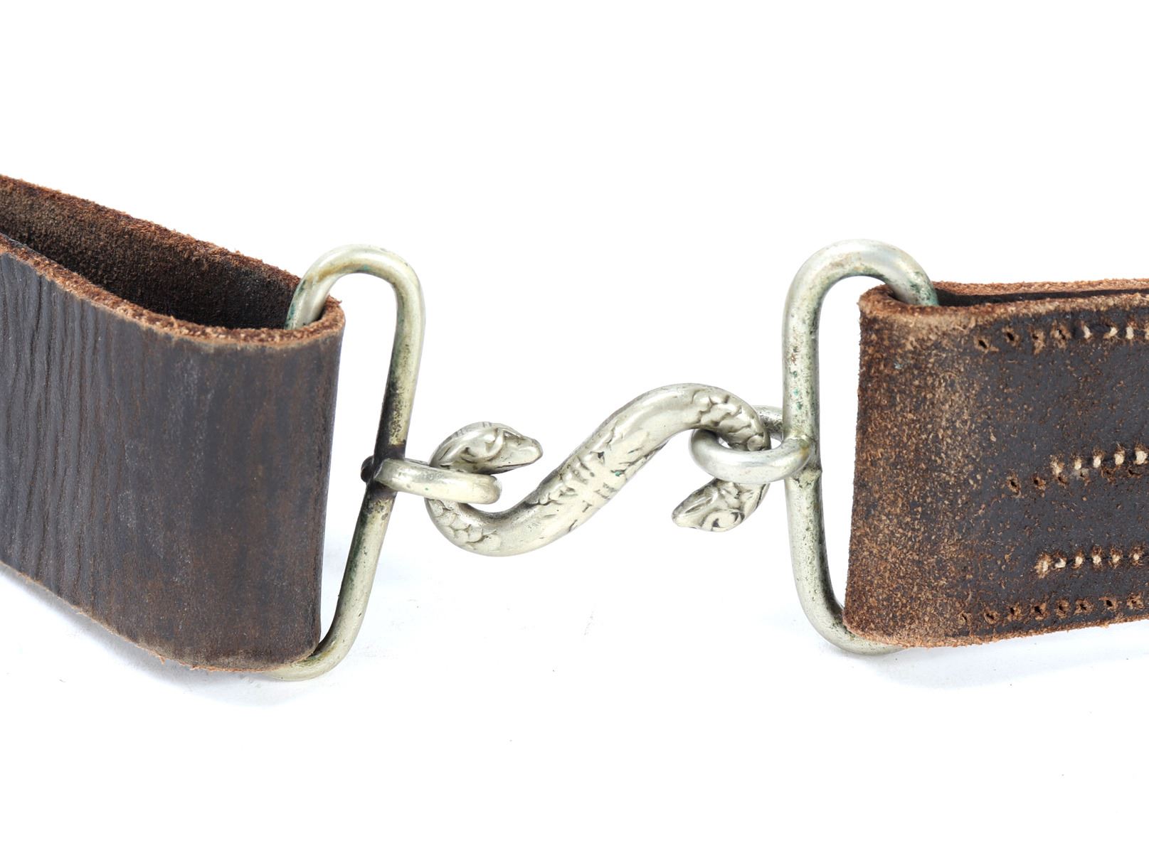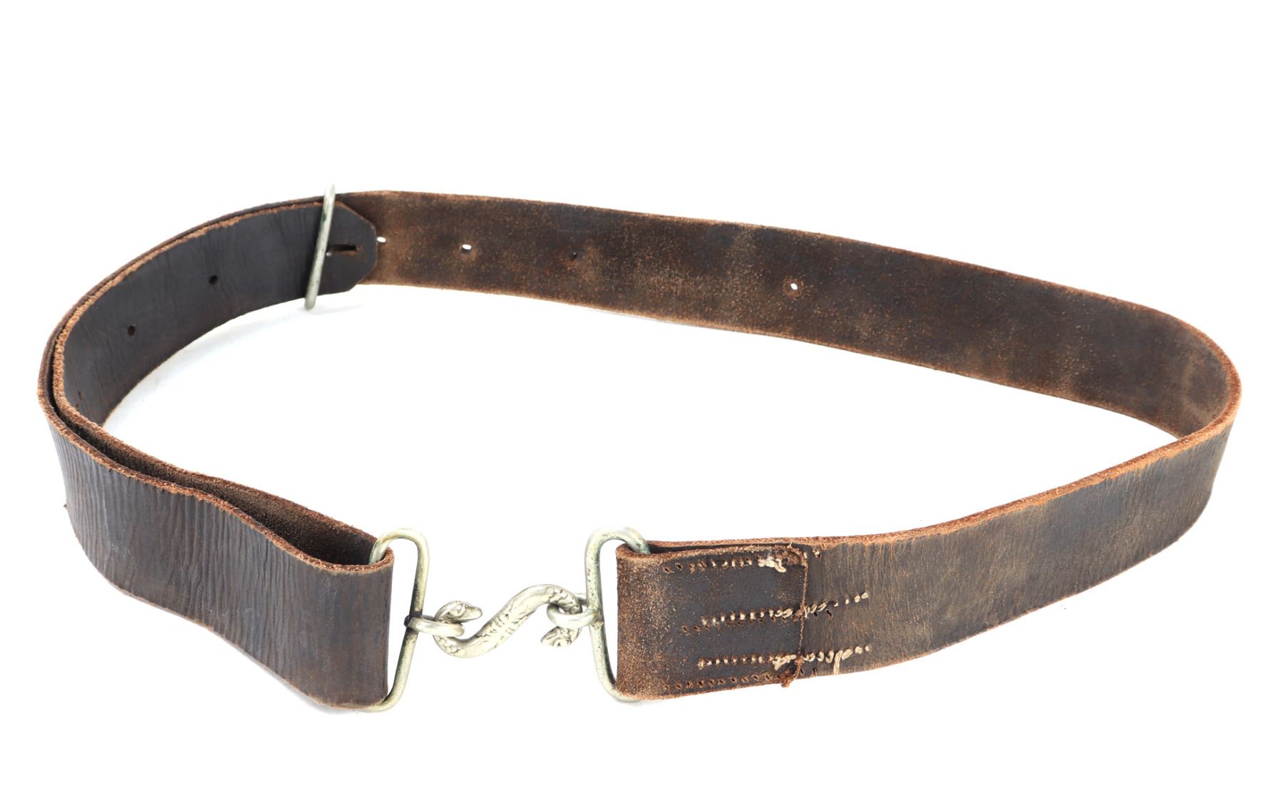 Confederate snake belt from the American Civil War period features a unique snake buckle clasp. Snakes were primarily known to represent resistance and defiance. Size 52" L, Snake Buckle 1 5/8" W. Condition: Wear as shown.. Provenance: Ex-Southern California Collection