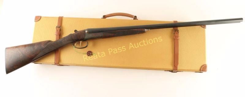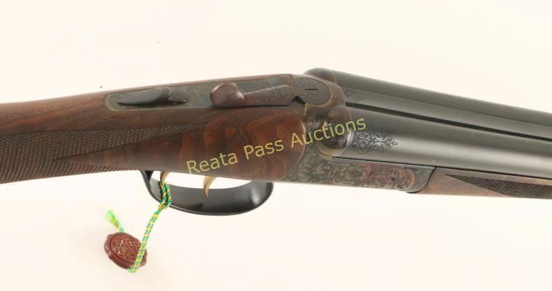 SN: RBL001514 'Launch Edition' Fine American made round-action side-by-side shotgun chambered for 2 3/4" 20 gauge shells. Features 28" blued barrels with removable imp. cyl. & skeet chokes, automatic ejectors, concave rib, brass bead front sight, scroll engraving, case hardened receiver, double triggers, auto tang safety, checkered top-lever, 14 1/4" length of pull, fancy checkered 3x walnut forend and straight grip shoulder stock with serrated hard rubber buttplate. Includes a Galazan tradition English style trunk case wrapped in canvas with felt lined interior which includes a cleaning set, accruements and leather choke pouch with full, modified, improved modified & tool. Shotgun exhibits approximately 99% of it's original finish with only minor wear on the forend iron observed. Action is smooth, bores are impeccable and wood stocks are extra fine showing only a very small loss on left side of the forend in the top right corner. Condition is like new in case. ***Modern Firearm***