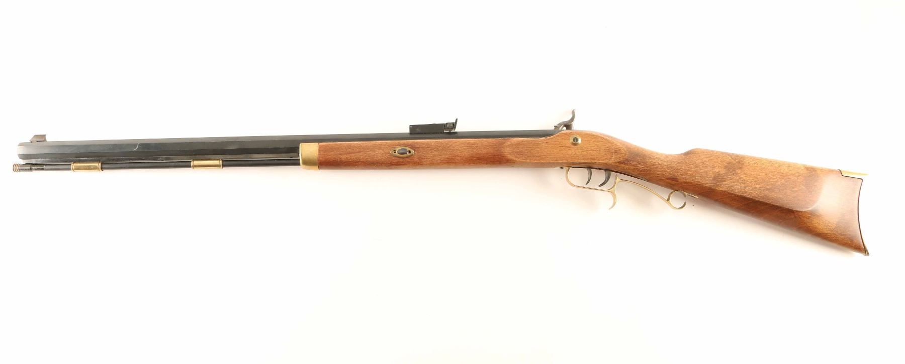 SN: 61-13-048100-98 Modern production Spanish made .50 caliber percussion rifle in classic Hawken style. Features a blued 28" heavy octagonal barrel, blade front sight, adjustable rear sight, double set trigger, black synthetic ram rod, brass furniture, case hardened lock, finger rest trigger guard, patch box, serrated hammer spur, and full-length hardwood straight grip shoulder stock. The barrel retains approximately 93% of it's original blued finish with an area of cleaned pitting near the muzzle and small freckles of surface rust scattered on the left side of the barrel. Action is crisp, bore is clear and wood stock is good. Condition is good to very good. ***Antique Firearm***