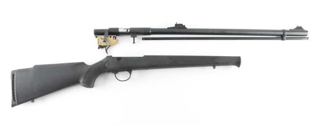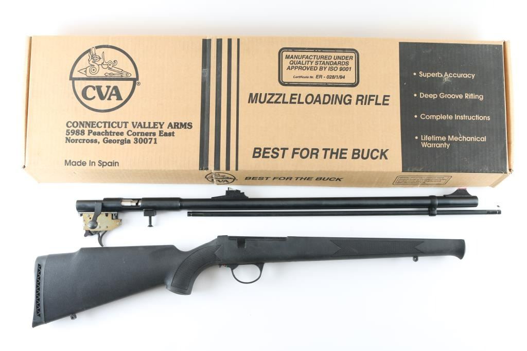 SN: 61-13-146147-01 Bolt Action muzzle loading rifle using inline percussion ignition, made in Spain for CVA. Appears to use 209 primers for ignition. Suitable for black powder or appropriate substitute such as Pyrodex. Features matte blued 24" barrel with polymer ramrod underneath, black polymer stock with sling studs, fiber optic insert sights with adjustable rear, breech plug removal tool with spare breech plug. CVA made different breech plugs for other ignition systems (#11, Musket caps), not provided. Rifle is like new in box (the box lists a different CVA model), unassembled, with light scuffs and handling marks. Condition is NRA Excellent *** Antique Firearm ***