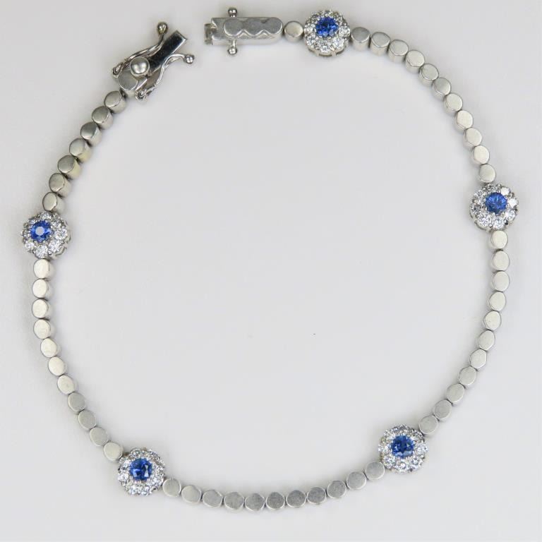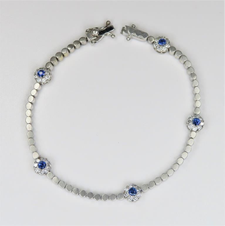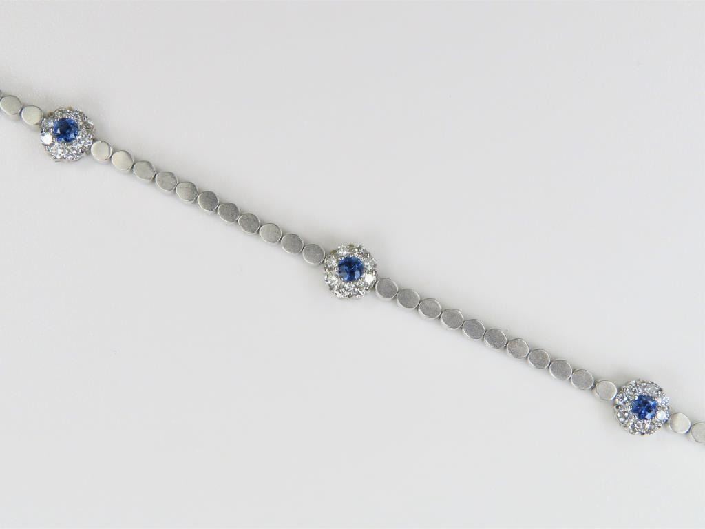 featuring 44 ‘IDEAL’ cut Diamonds and Natural Ceylon Sapphires weighing approx. 1.00 carat set in a 14 karat brushed white gold circular link bracelet. Retail $2,500-$3,000