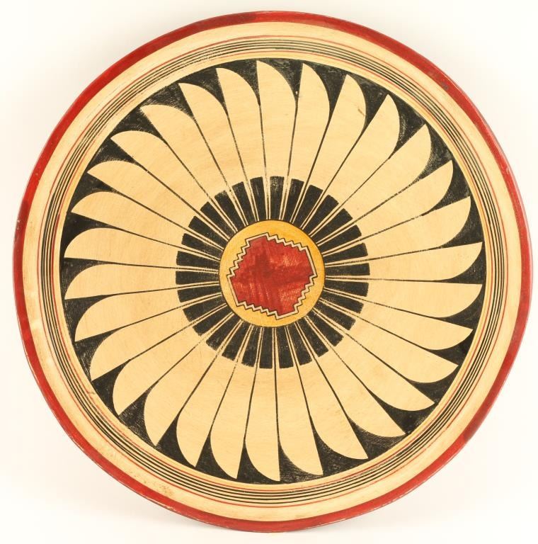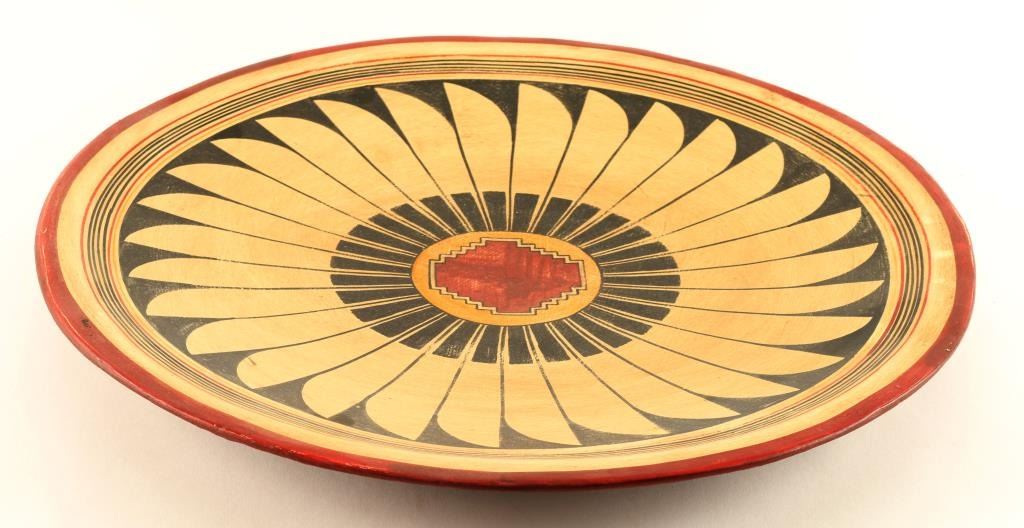 Polychrome finish with feather design. Measures 18", excellent condition.