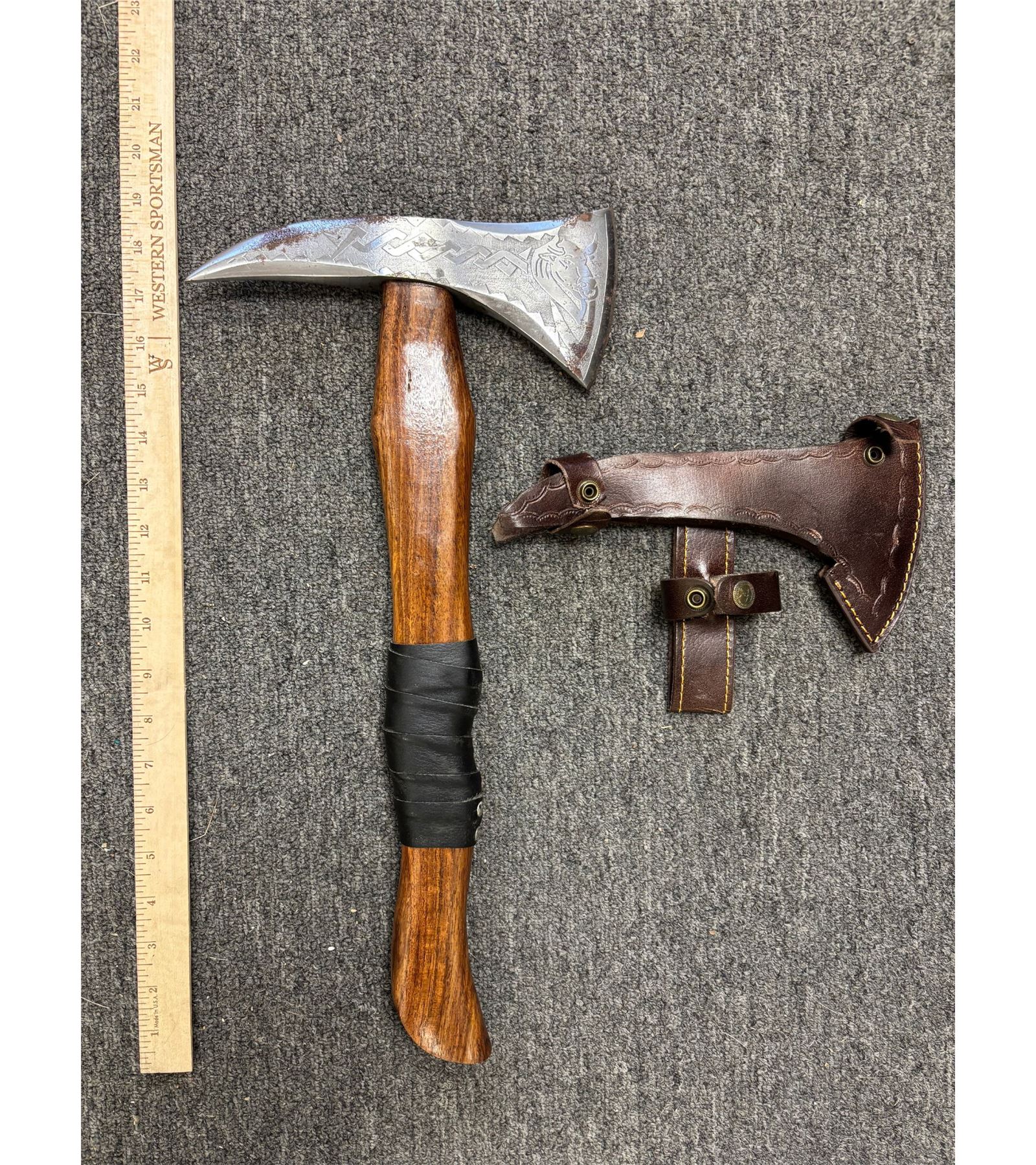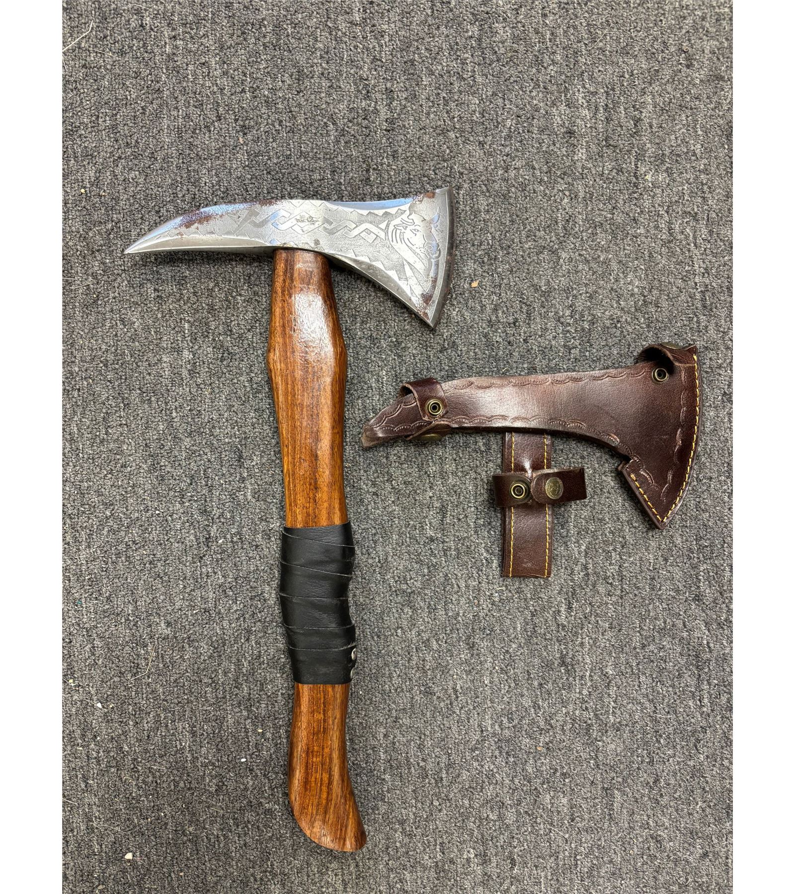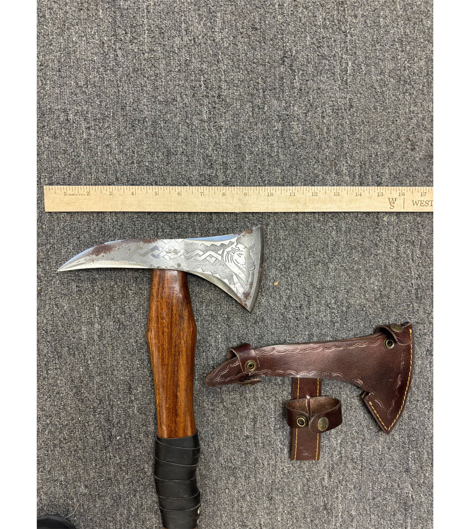 Contemporary Viking Battle AXE or Hatchet. It has a Steel Blade and a Leather Sheath. The wooden handle measures 17" Long and the Total Length is 18" Long. This would make a great Renaissance Fair Accessory! AXES AND MACHETES