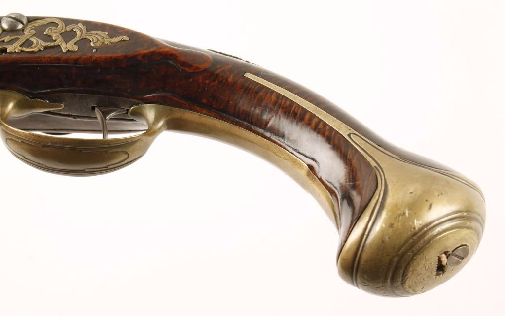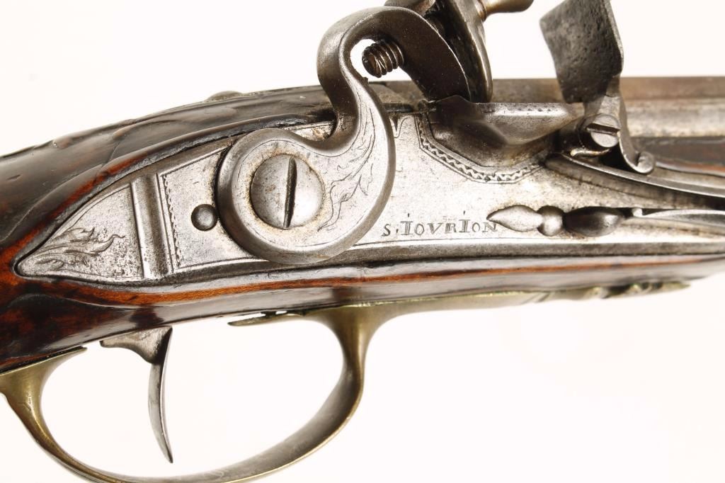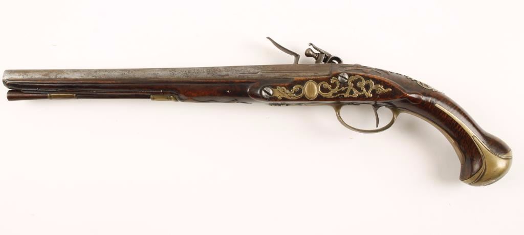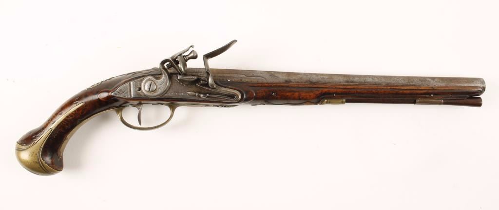 Beautiful and ornate horseman's size flintlock pistol approximately .60 caliber, circa 1725-1760. Features a 12" contoured barrel with flat top rib, lightly engraved lock signed S Iovrion, one piece carved burl wood stock, wood ram rod and brass mounts, escutcheons and side plate with snake or dragon effigy. Butt cap is missing mask or emblem which was formerly pinned to butt cap. Finish is uniform bare metal with scatted shallow dark pitting. Action is strong and stock is very good with a series of dings on the handle. A nice old original flintlock, the type carried during the American Revolution, French & Indian Wars. Measures 20" Overall. Condition is excellent as antique. ***Antique Firearm***