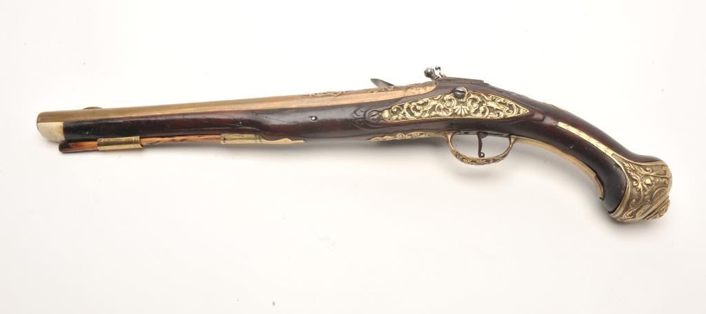 Continental flintlock pistol, .45 caliber, 13” highly decorated bronze barrel, fancy mounts, wood stock, in overall very good + condition with bone forend cap and raised carving to the stock at the top of the wrist; great gentleman’s face on butt cap along with a royal looking man’s profile on mounting at mid-wrist. (Antique). Est.: $2,500-$5,000.