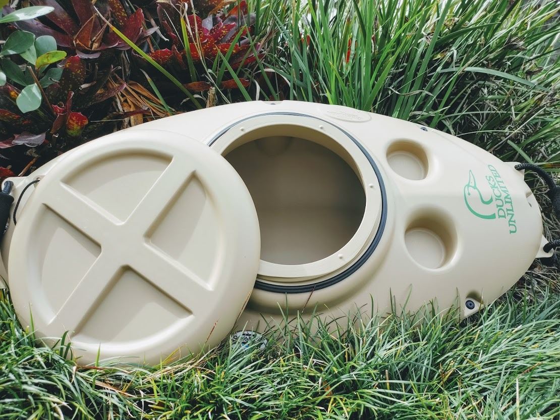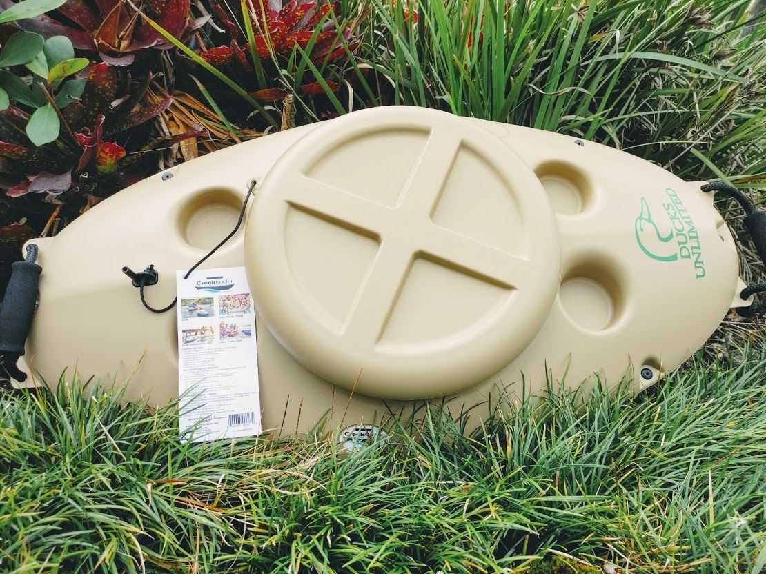 DU Ducks Unlimited 30 qt. Floating Cooler-includes 4 cup holders, a double-wall blow molded design with foam insulation, padded handles, and large watertight lid. Holds up to 30 12ounce cans & 20 pounds of ice with up to 48 hour ice retention.