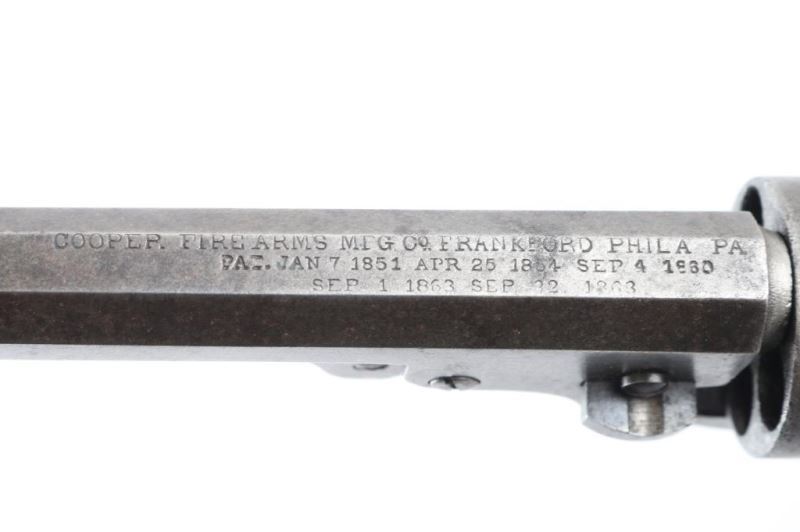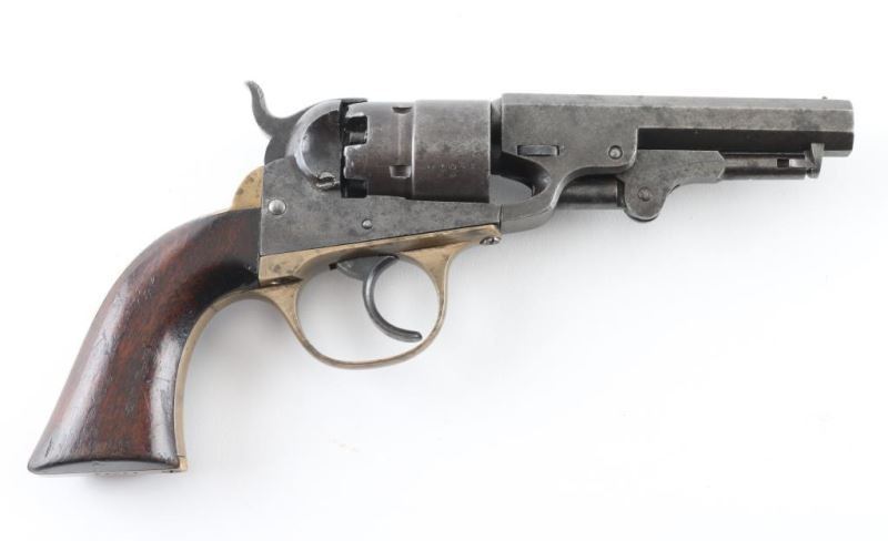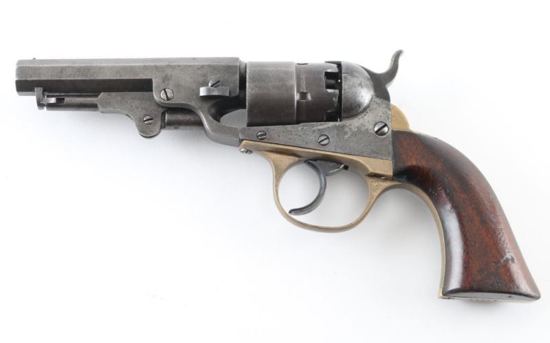 SN 11078 Civil War era and one of the first successful double action revolvers. 4" octagon barrel with loading lever. Brass triggerguard and backstrap. 5 shot unfluted & rebated cylinder. Bore is pitted, visible rifling. Good overall condition with clear address and walnut one-piece grip shows considerable varnish with minor imperfections. Matching numbers on cylinder & backstrap. Trigger will rotate cylinder, does not time up or index properly. A good representative example of a rare (only approx 15k manufactured) revolver. Condition is NRA Fair *** Antique Firearm ***