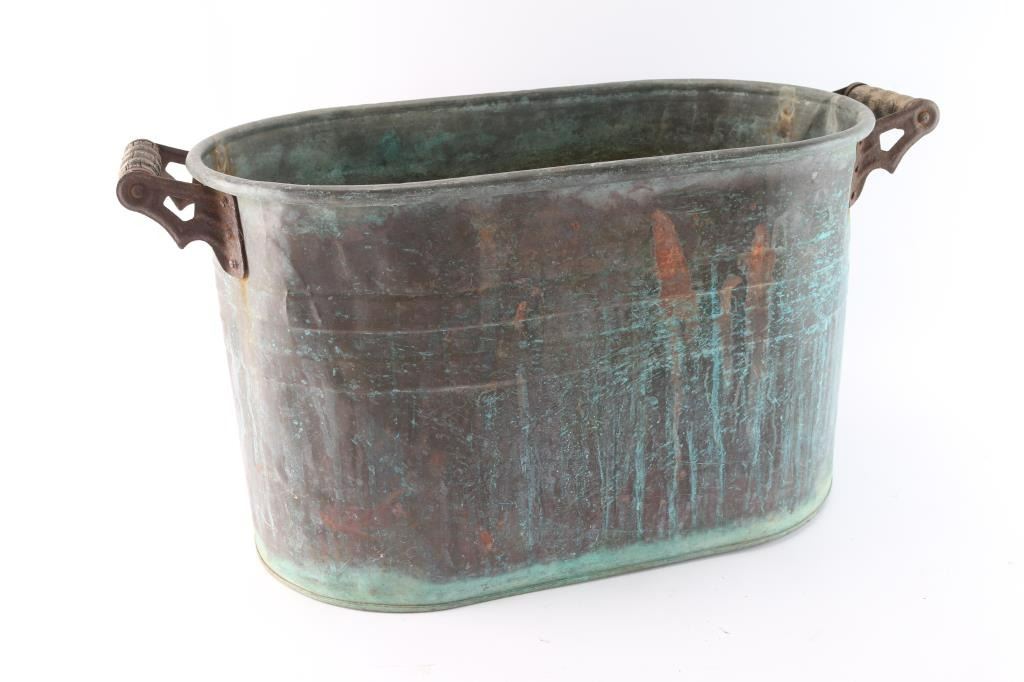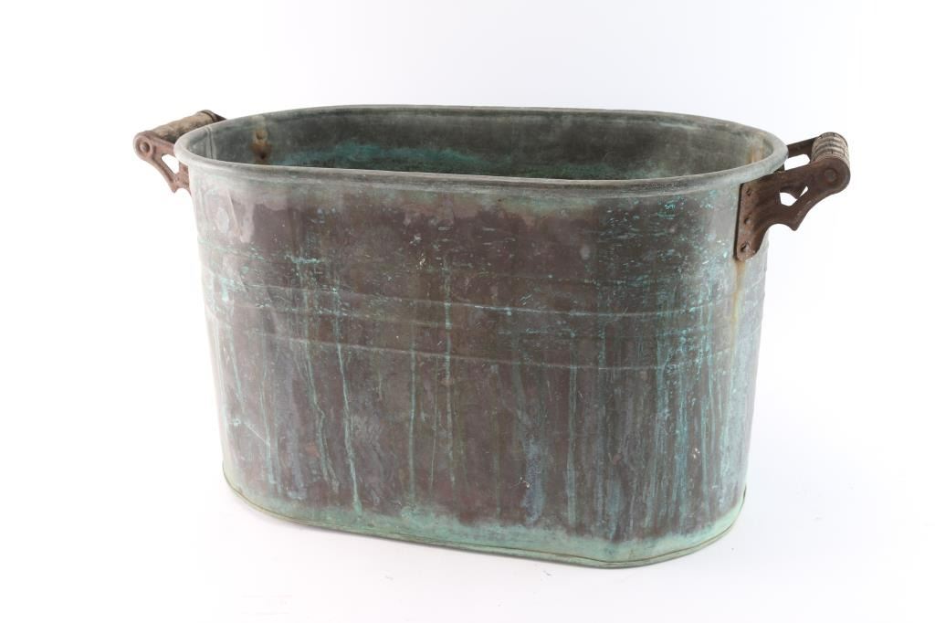 Oval tub with wood handles and heavy aged patina. Measures: 27" x 13" x 12"