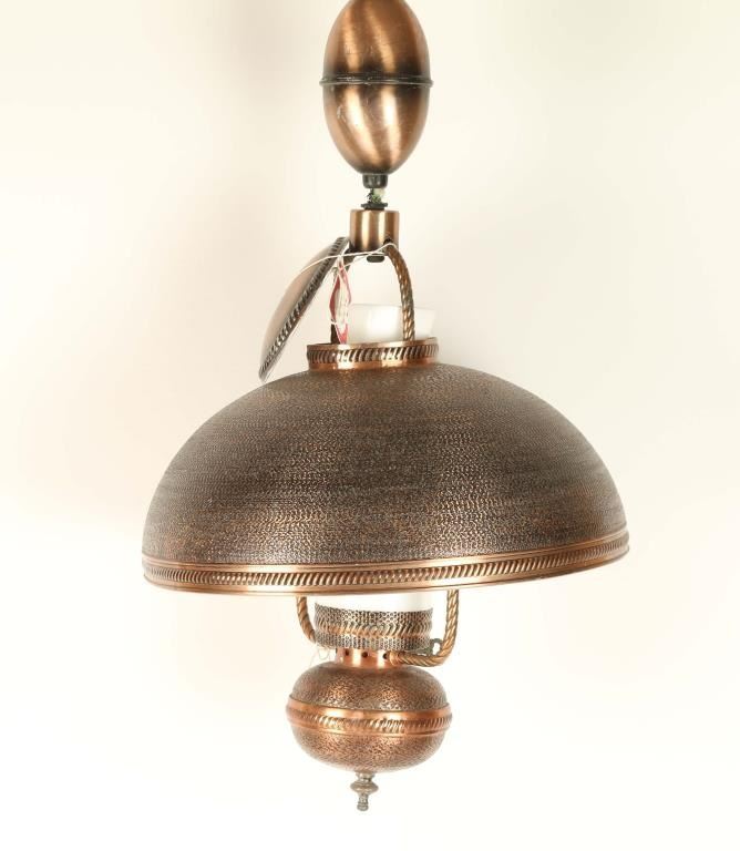 Copper shade and base with a white milk glass chimney. Must be hard wired.