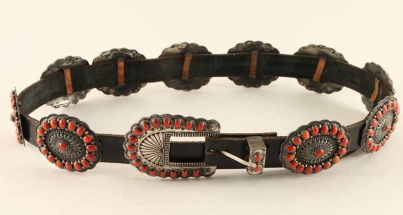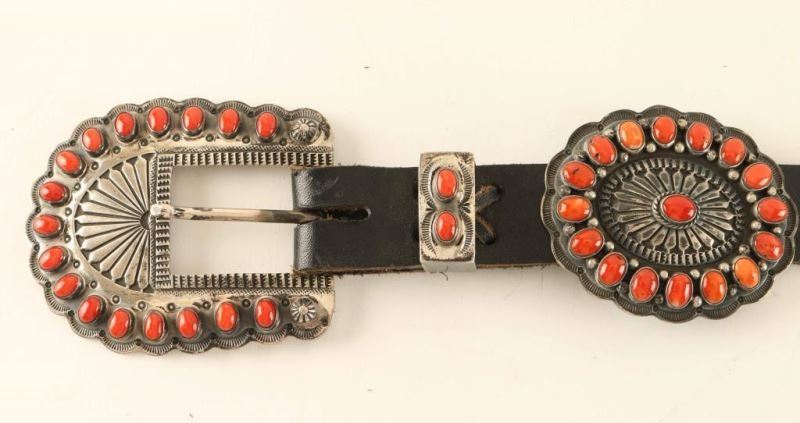 Ten scalloped edge floral motif oval conchos with center and surrounding coral cabs. Buckle is a scalloped arch with sunburst design and coral cabs. Marked 'D. Reeves' and 'Sterling'. Keeper is a small rectangle with two stones. Stunning variations in corals from deep red to light orange.