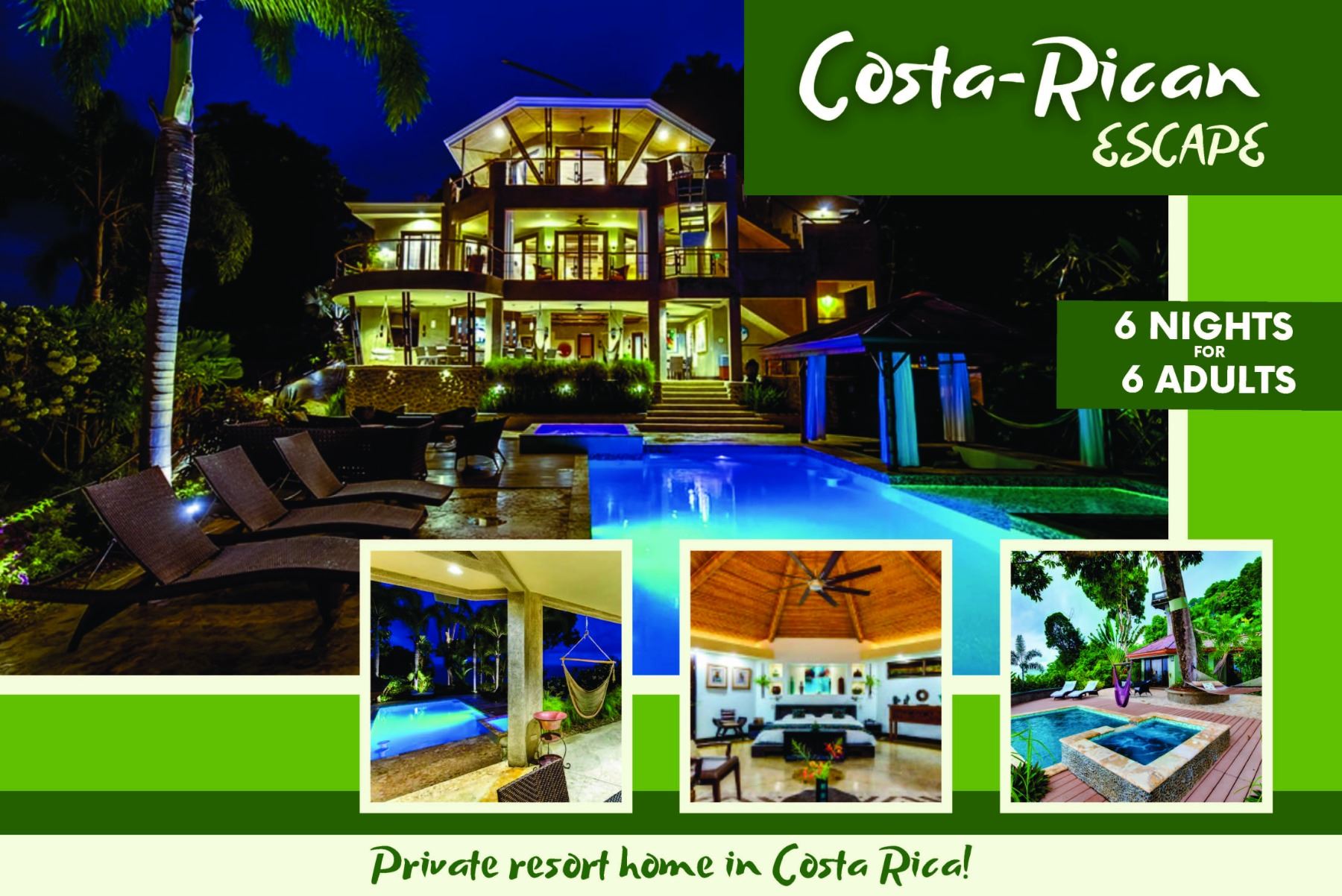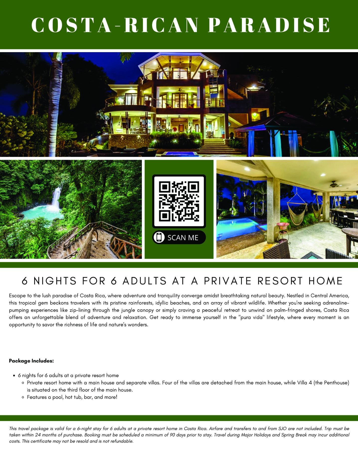 Escape to the lush paradise of Costa Rica, where adventure and tranquility converge amidst breathtaking natural beauty. Nestled in Central America, this tropical gem beckons travelers with its pristine rainforests, idyllic beaches, and an array of vibrant wildlife. Whether you're seeking adrenaline-pumping experiences like zip-lining through the jungle canopy or simply craving a peaceful retreat to unwind on palm-fringed shores, Costa Rica offers an unforgettable blend of adventure and relaxation. Get ready to immerse yourself in the "pura vida" lifestyle, where every moment is an opportunity to savor the richness of life and nature's wonders. Package Includes: 6 nights for 6 adults at a private resort home. Private resort home with a main house and separate villas. Four of the villas are detached from the main house, while Villa 4 (the Penthouse) is situated on the third floor of the main house. Features a pool, hot tub, bar, and more! Terms & Conditions: This travel package is valid for a 6-night stay for 6 adults at a private resort home in Costa Rica. Airfare and transfers to and from SJO are not included. Trip must be taken within 24 months of purchase. Booking must be scheduled a minimum of 90 days prior to stay. Travel during Major Holidays and Spring Break may incur additional costs. This certificate may not be resold and is not refundable. HGAVacations.com Website Link: https://www.hgavacations.com/punta-gabriela.html