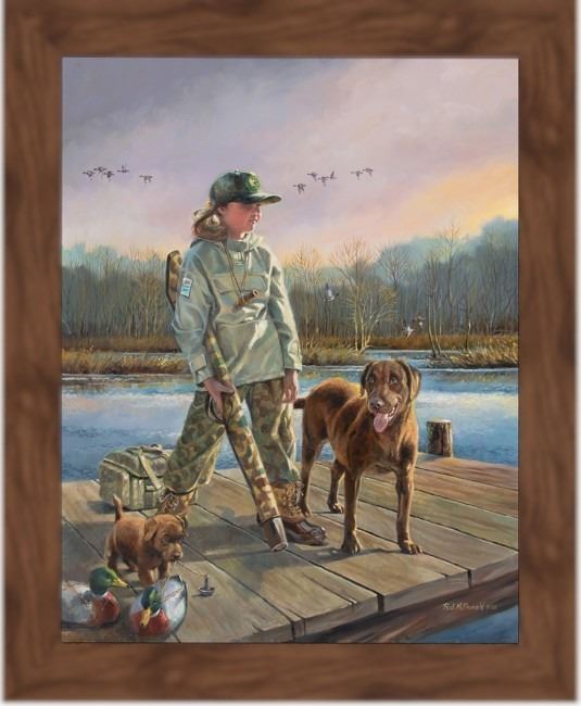 Originally published as a lithograph in 2002, “Count Me In” by Ralph McDonald returns as a special encore edition for 2026, now beautifully presented on canvas. Set on a quiet dock, a young girl stands confidently, dressed in camouflage and proudly wearing a Ducks Unlimited patch. By her side are two loyal companions—a mature chocolate Labrador and an eager puppy—symbolizing the past, present, and future of waterfowl hunting. Decoys lie at their feet, and a flock of ducks soars in the distance, enhancing the anticipation of the hunt. McDonald’s talent has been a cornerstone of Ducks Unlimited’s art program since 1979. With his works generating over $30 million for DU’s conservation efforts, McDonald ranks among the organization’s most impactful artists. Measuring 24” x 30”, this classic scene celebrates both the legacy of conservation and the next generation of hunters.