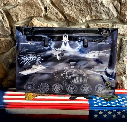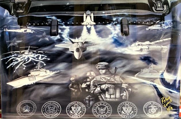 This 20x30 picture of the incredible hood that Ryan Evans airbushed on the hood theMilitary vehicle that was built by Count's Kustoms for Camp Freedom. This is # of This is your only opportunity to get this signed version of this incredible paint job that Ryan did without being present at the event.