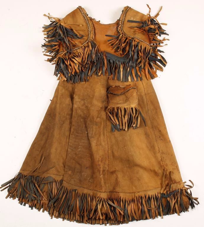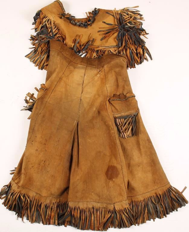 Including a brown suede split skirt with fringe, and a brown and blue suede fringed vest. Overall fair to good condition shows age and use.