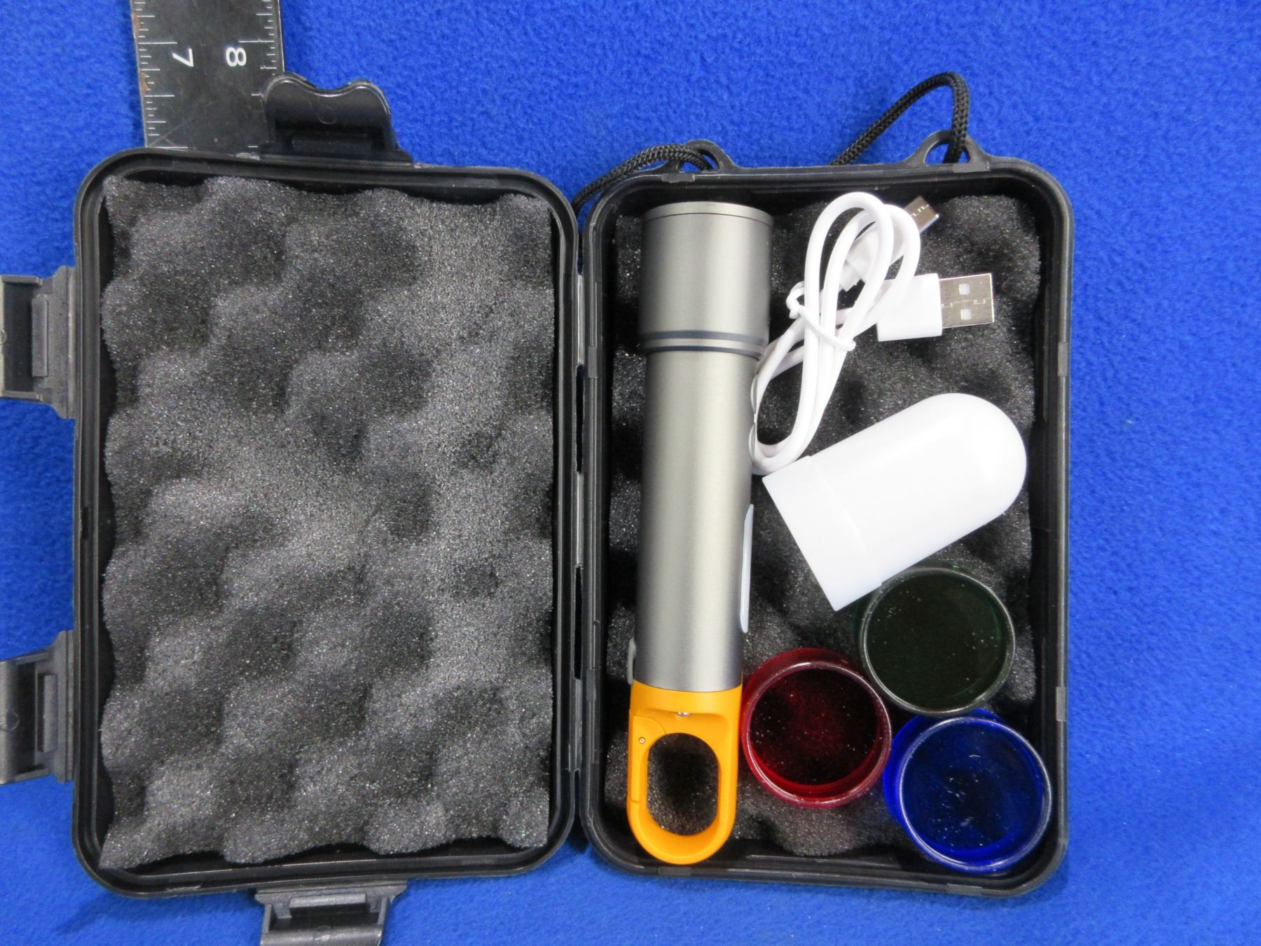 Cree LED Ultra Bright Flashlight - USB Rechargeable - Flashlight has a carabiner, dome cover, 3 color covers and a carry case