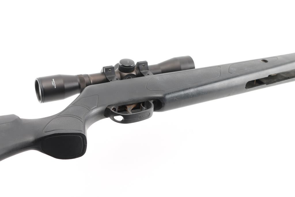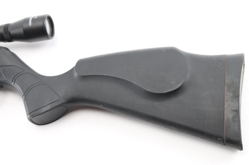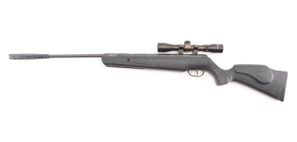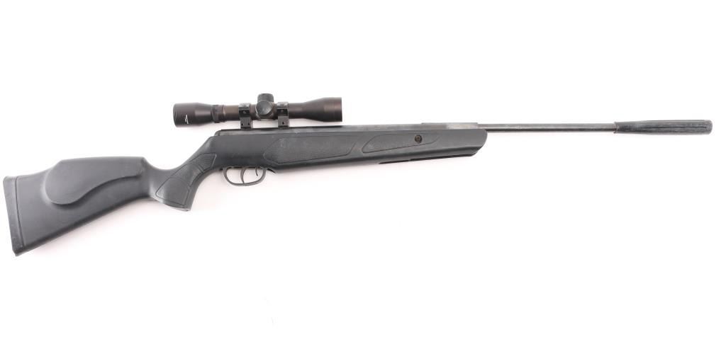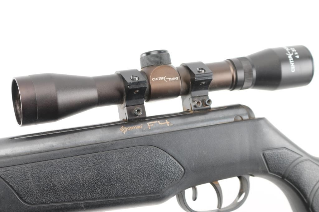Crosman F4 break barrel .177cal rifle is powered by Nitro Piston Technology (Gas) that shoots up to 1200 fps with alloy ammo. Synthetic, black, all-weather material. This air rifle boasts a smoother cocking effort and offers reduced recoil and 70% less noise with the Quiet Fire Baffled Barrel Technology. Includes a Center Point 4 x 32 precision scope. Enough FPE for small games, varmints, or backyard plinking, Overall very good condition, barrel has some minor scattered surface rust.