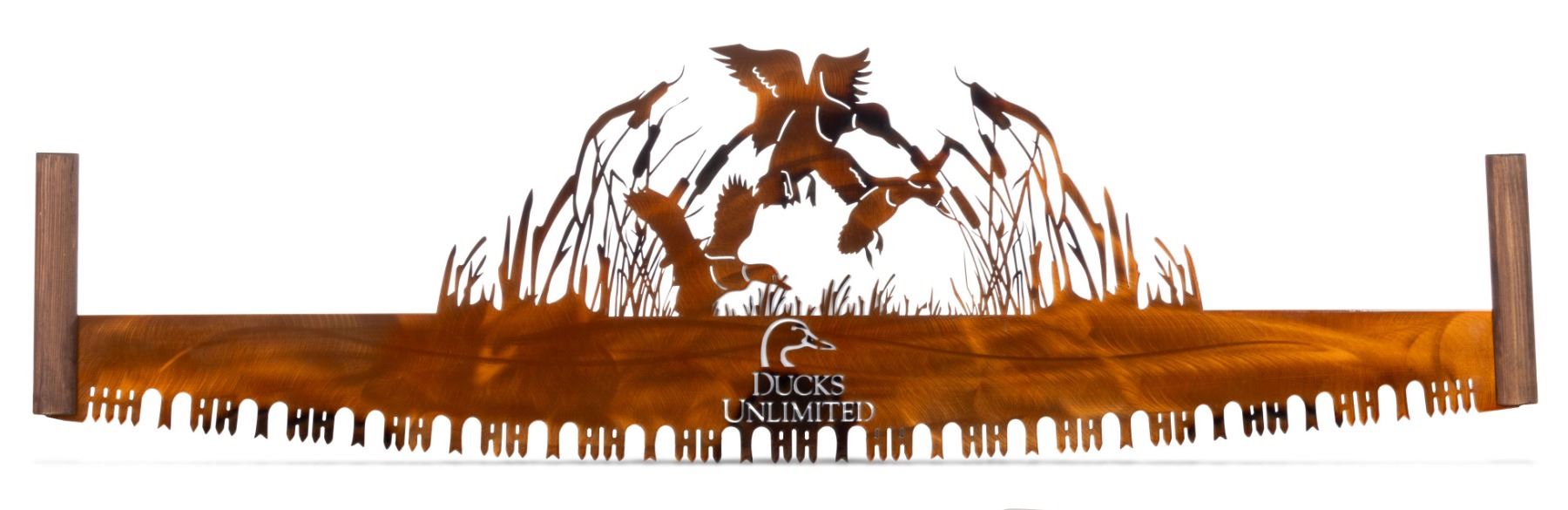 The Crosscut Saw embodies the rustic charm that complements any home's décor. This 14-gauge laser cut metal Crosscut Saw adds a touch of authenticity with its depiction of 3 Mallards in flight, cattails, and the Ducks Unlimited logo, elegantly stacked. The rust patina powder coating lends an antique aesthetic, while wooden handles evoke the genuine look of a traditional saw. Crafted with care in the USA making it a distinctive addition to your space. Perfect for enthusiasts of both woodworking and wildlife, the Crosscut Saw brings a touch of nature's splendor into your home, capturing the essence of Ducks Unlimited's mission with every detail.