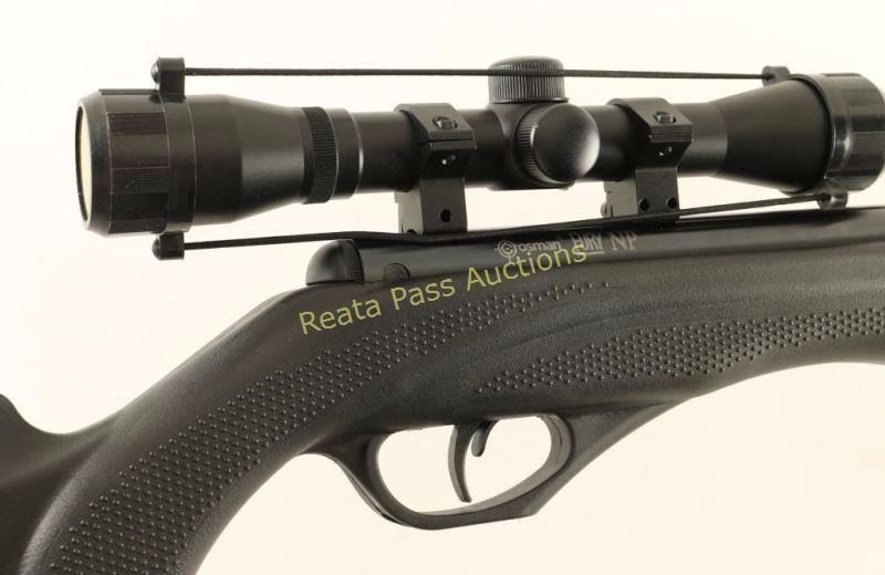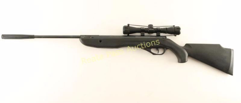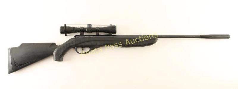 Break-action single shot pellet rifle with blued finish, Center-Point 3-9x scope, manual safety and pebbled black synthetic pistol grip shoulder stock with rubber recoil pad & high comb. Condition is excellent.