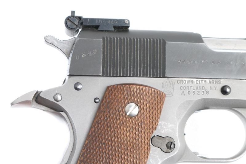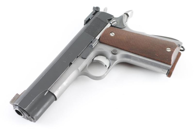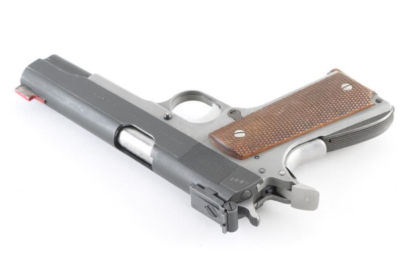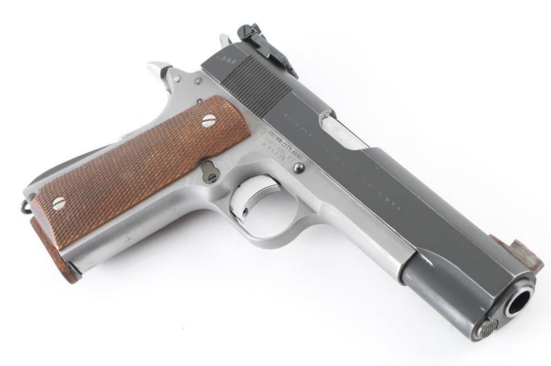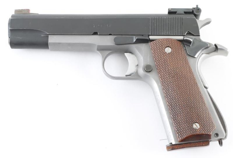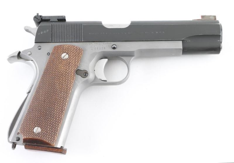 Semiautomatic pistol features matte blued slide, matte stainless frame, 5" barrel, partridge front sight, adjustable Bo-Mar rear sight, manual thumb safety, beavertail grip safety, serrated spur hammer, serrated trigger with over travel adjustment, arched serrated mainspring housing with lanyard loop, checkered wood grips. Bore is very good condition. Retains 90% finish with scratches and other handling marks, some edge losses. Grips are good condition, some smoothing to checkered surface. Slide marked "7790314" on left, Colt address on right. Includes (1) magazine with leather base pad. Condition is NRA Very Good++ *** Modern Firearm ***