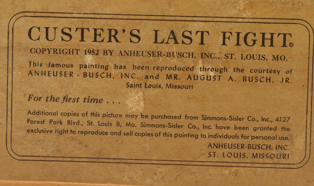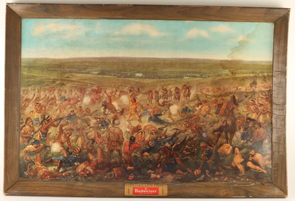 Famous Budweiser advertiser print on cardboard painted originally by Cassilly Adams. Image measures 37 1/4"x23 3/4" with title block below. Water damage on right side.