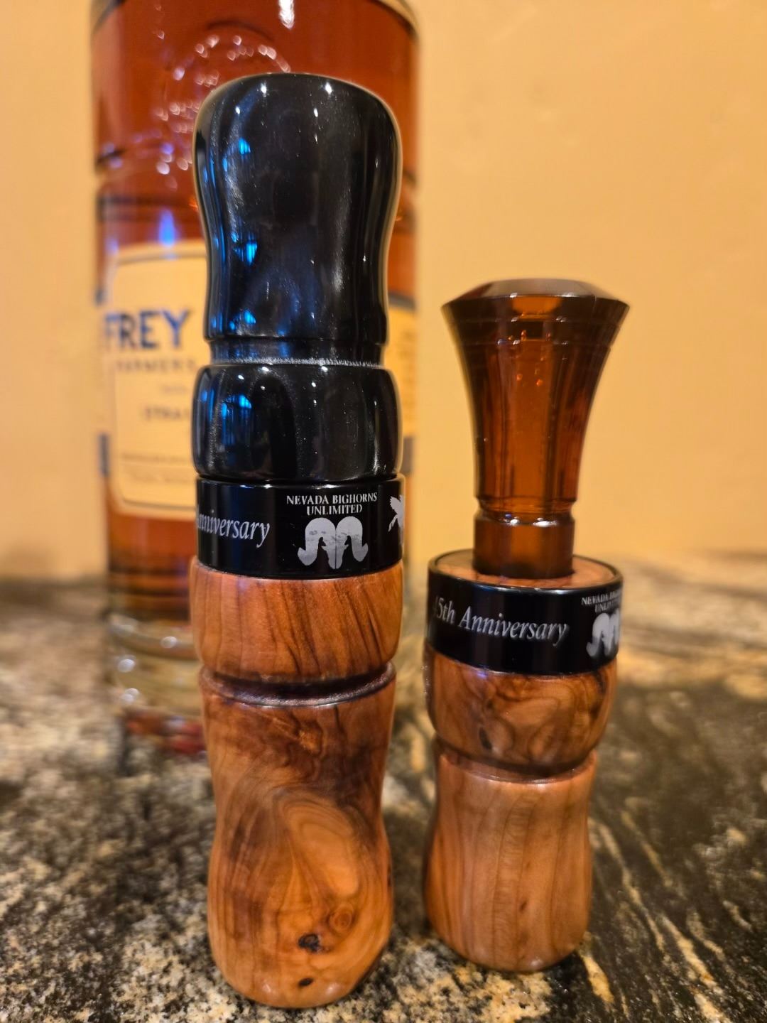 Custom "NBU 45th Anniversary" Duck and Goose Calls by Red Sky Custom Calls made with Hawaiian Yew wood.