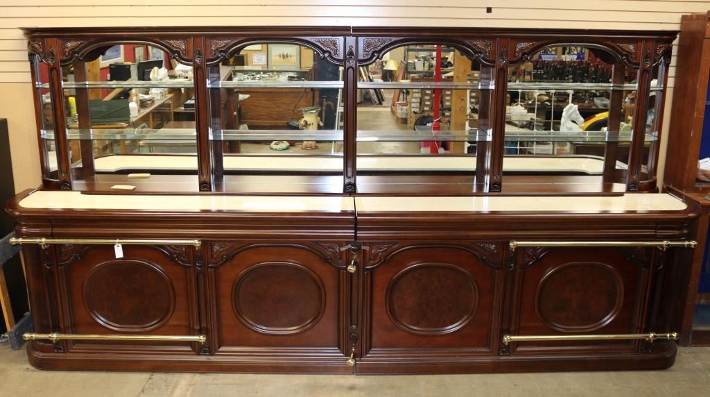 Two piece mahogany finish unit with a Victorian style ornamentation with a mirrored back and eight glass shelves. Lower interior doors and display shelves with interior lighting in each section. Front countertop bar has Victorian motif with circular design, has two brass foot and handle rest. Counter top is a white and cream colored stone. Measures 14' 10"l x1 0"x7' 2"h back bar, front bar measures 14" 5 1/2"l x 43"h. Consignor originally paid $8500. Excellent overall condition.