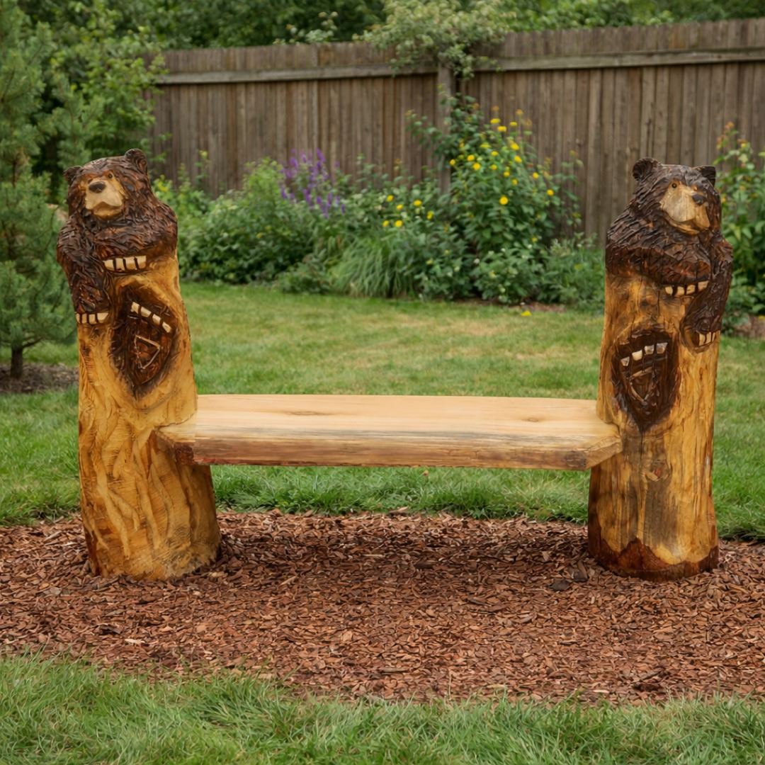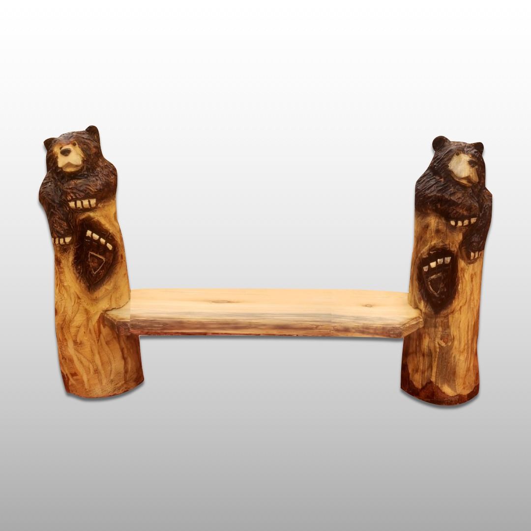 Known as the carvers of the hills, Jarrett and Jordan Dahl are award- winning, internationally recognized chainsaw artists who use the backdrop of the beautiful Black Hills to create their chainsaw carvings. This original piece of chainsaw art depicts two bears each protruding from sturdy posts on each side of the bench. The bench was carved from Black Hills (ponderosa) pine or other local woods, which adds to its uniqueness. No piece of art they produce is identical to another. This pair of bears would love to sit with you at your home or cabin!
