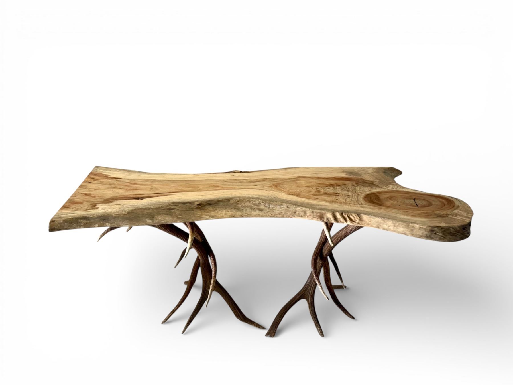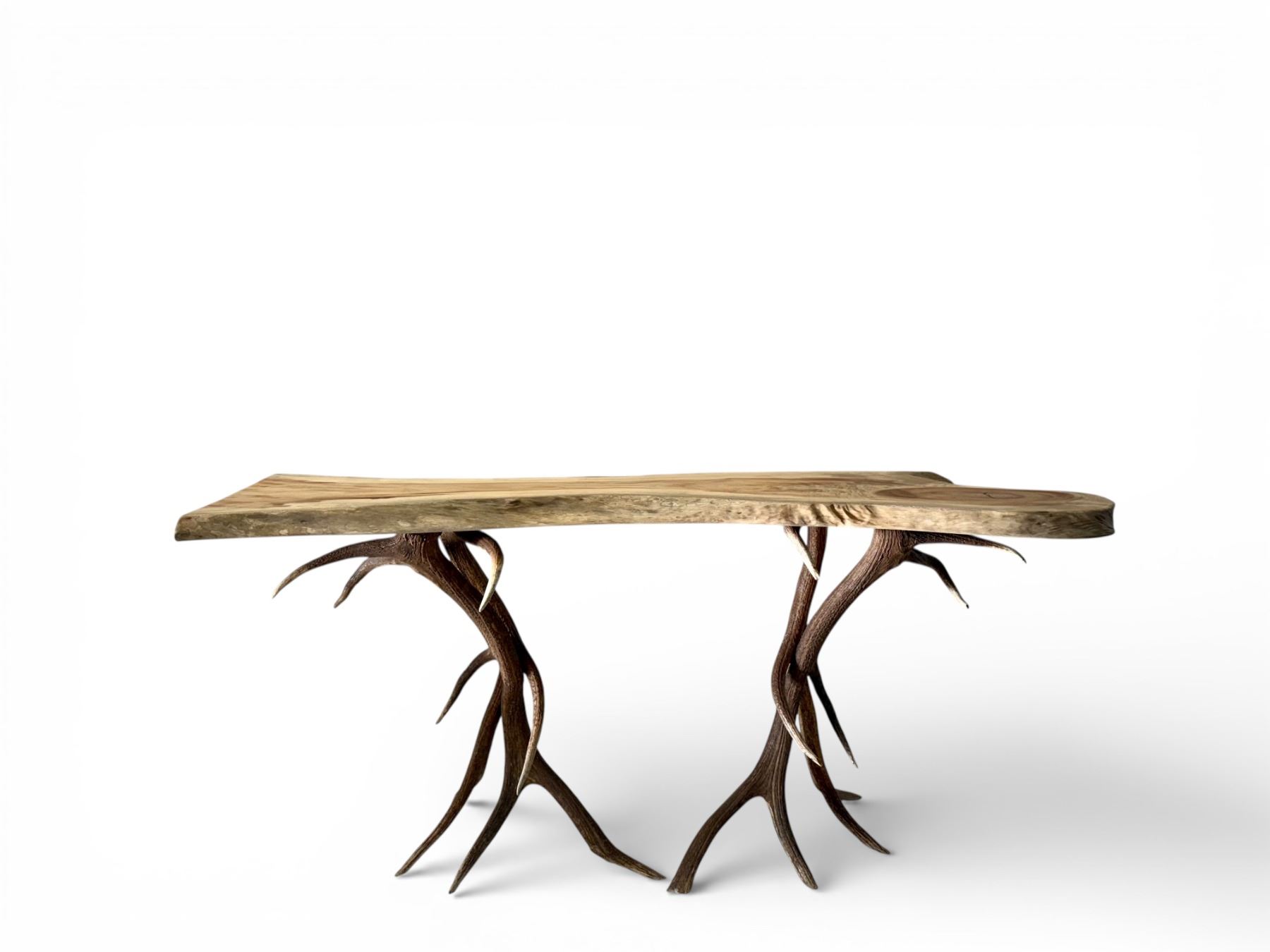 With appreciation to Lake AntlerWorks, this striking Camphor Wood Credenza Table is a true statement piece expertly crafted by the award-winning artist Joseph Lake. Measuring 24” x 70” x 34” tall and weighing approximately 150 pounds, the table features a substantial, live-edge slab of richly grained camphor wood. The natural contours, knots, and tonal variations of the wood are preserved to highlight its organic beauty, creating a surface that feels both sculptural and functional. Camphor is prized not only for its durability and aromatic character, but for the depth and warmth of its grain—making each piece entirely unique. Supporting the slab are hand-selected antler bases that form the table’s foundation. Carefully arranged for balance and strength, the antlers provide architectural integrity while maintaining an unmistakable lodge aesthetic. The contrast between the smooth, flowing wood top and the dynamic, natural antler forms beneath creates a visual harmony that is both rustic and sophisticated. Ideal as a credenza in an office, an entryway statement in a mountain home, or an accent piece in a refined hunting lodge, this table blends artistry, heritage, and function into one heirloom-quality furnishing. A remarkable work from Lake AntlerWorks—where craftsmanship and the outdoors converge in enduring design. For more information, contact Joseph Lake by email at lakeantlers@gmail.com or by phone at 307-359-8804. Company's website: www.lakeantlerworks.com