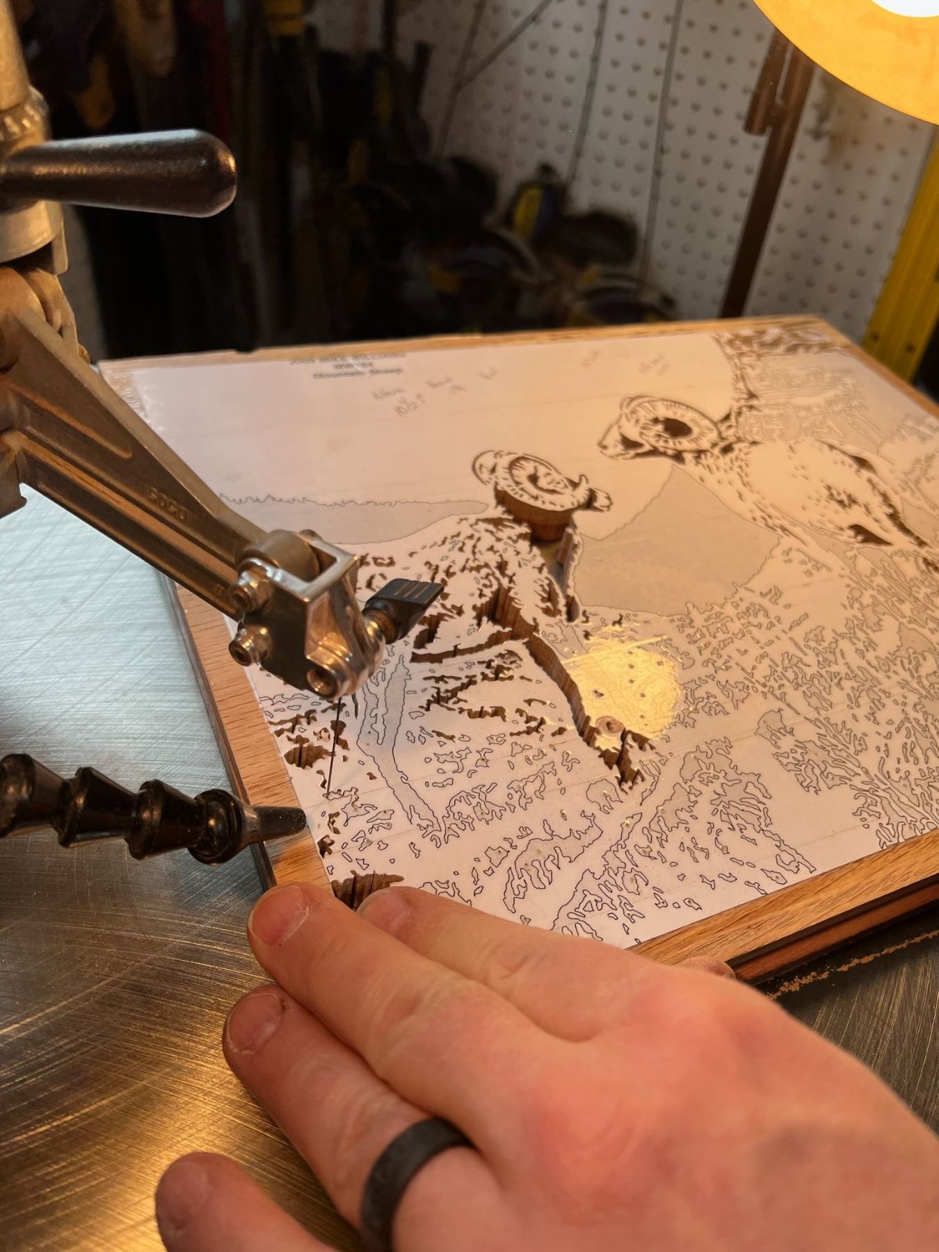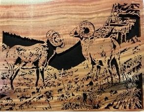 One-of-a-kind custom hand cut scroll saw piece is cut into Carob, which is an Eastern Mediterranean hardwood. This piece is not only showcasing the beautiful wood but the exquisite wild sheep as well.