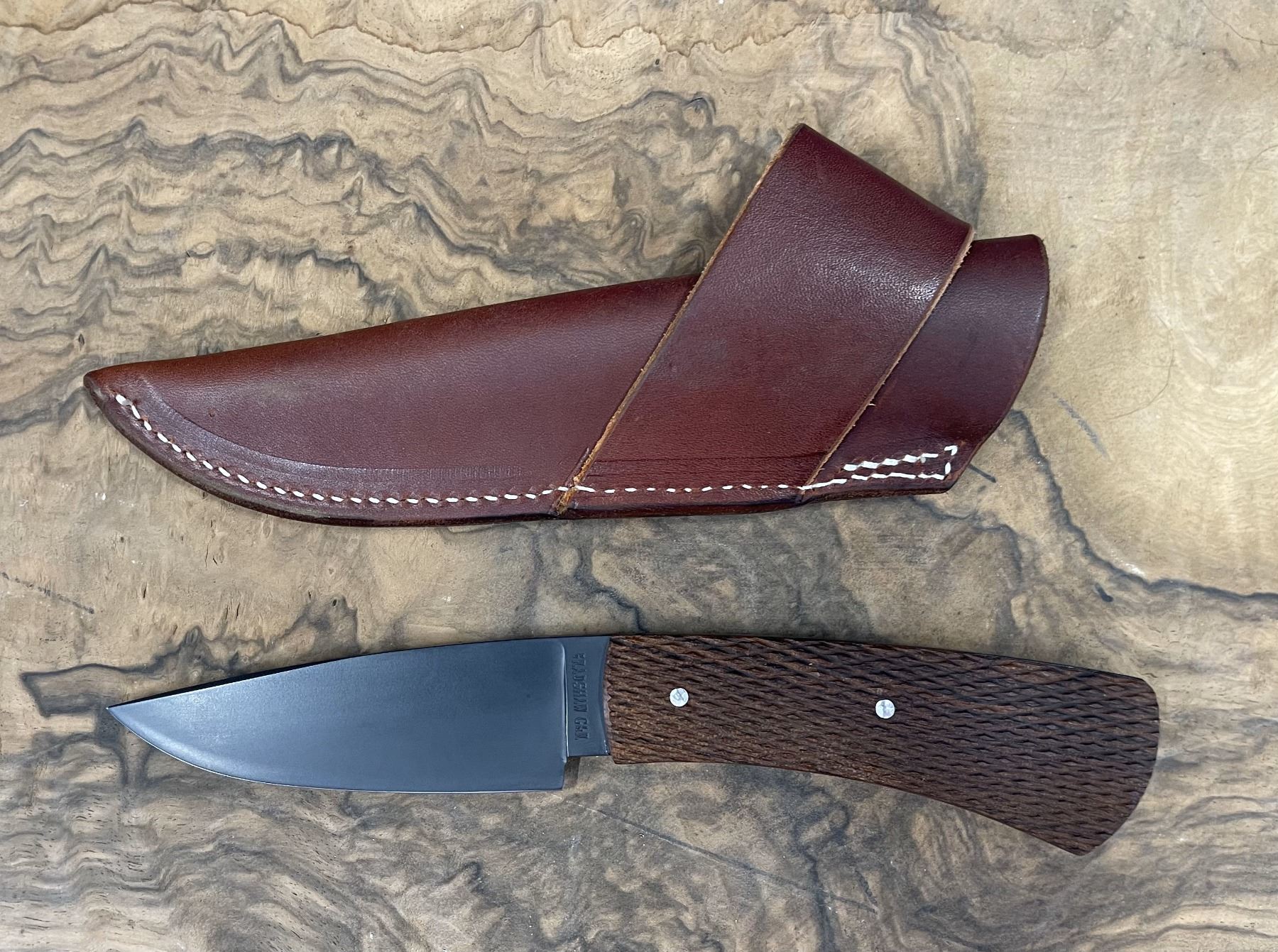 3 7/8” blade from DET annealed 52100 bearing steel, heat treated and tempered to Rc 60, finished with elite series cerakote in a rust blue mimicking blue/black color. The entire blade and tang is coated so rust will never be an issue under the handle. The knives are 8 1/4” overall, with full length tangs. The handles are made from Mexican Bocote wood, checkered and oiled. The knives come with a fine leather crossride sheath made by Bobby Bobbitt, a great saddlemaker in Wills Point, Tx.