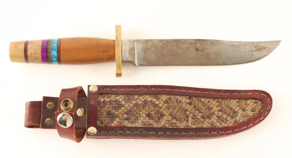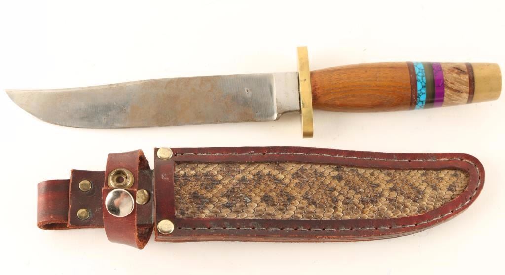 Measures 12" overall with a 6 1/2" blade and brass guard. Wood handle has stone inlay with a brass end. Blade shows some rust. Comes in a leather sheath with a rattlesnake front.