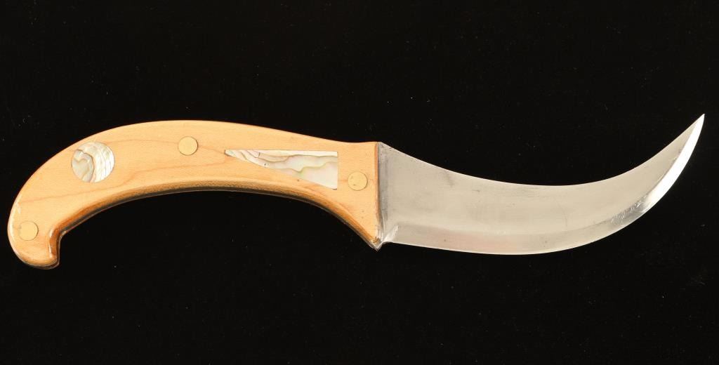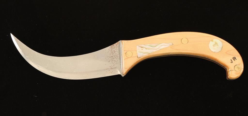 Curved blade with wood handle that has abalone inlay marked 'JR'. Measures 9 1/2" overall with a 4 1/2" blade. Some rust on blade on one side near handle.
