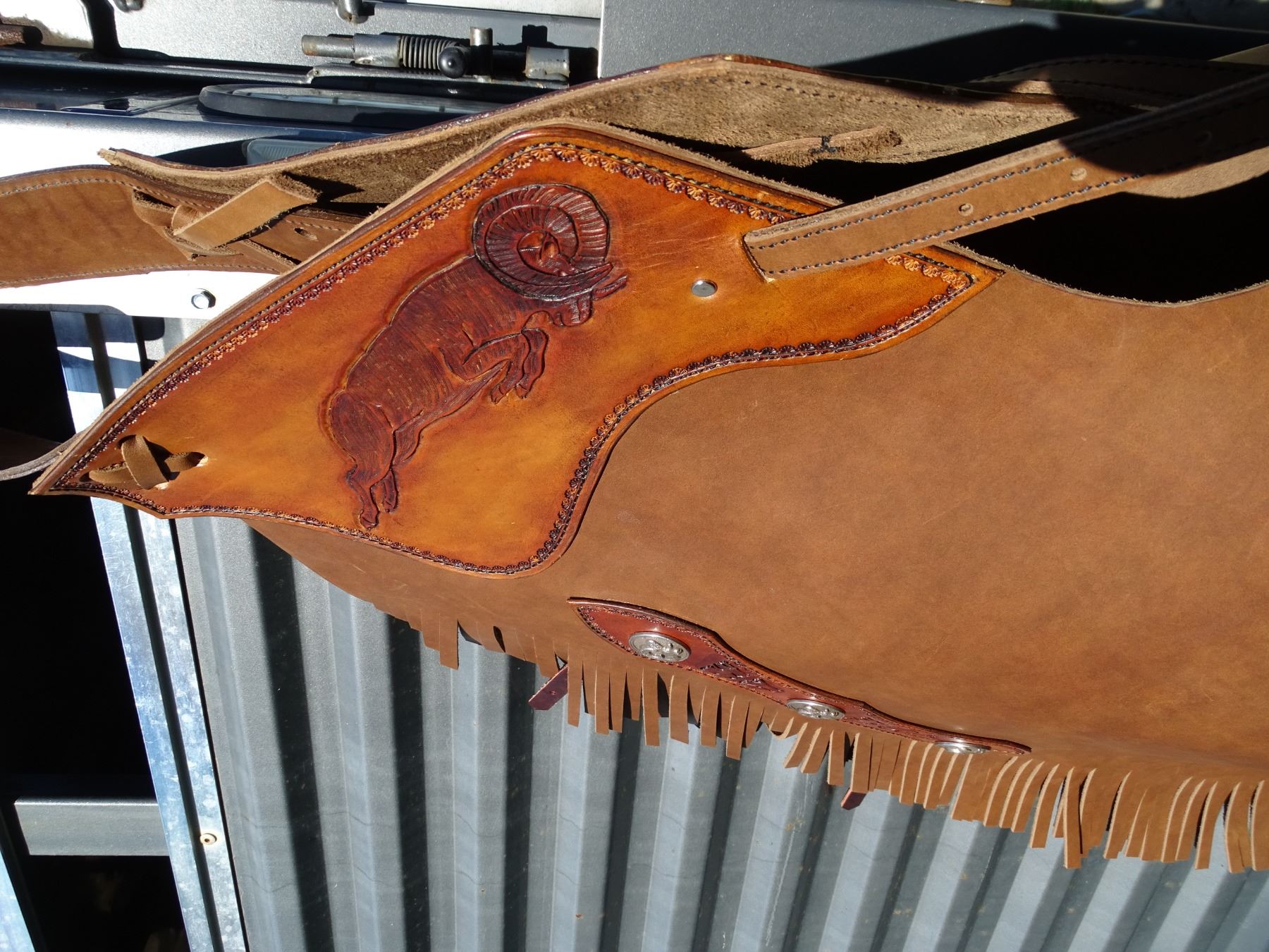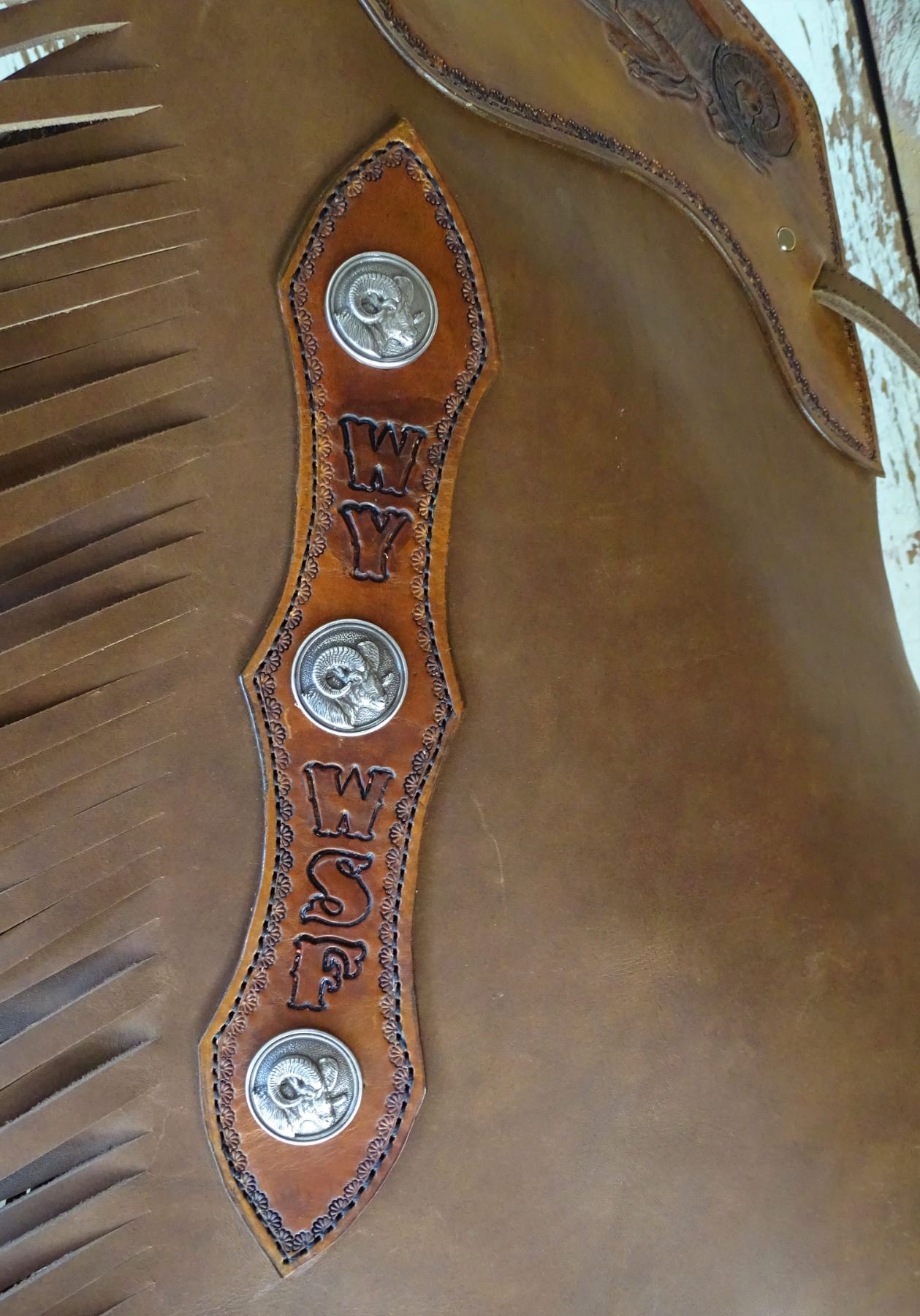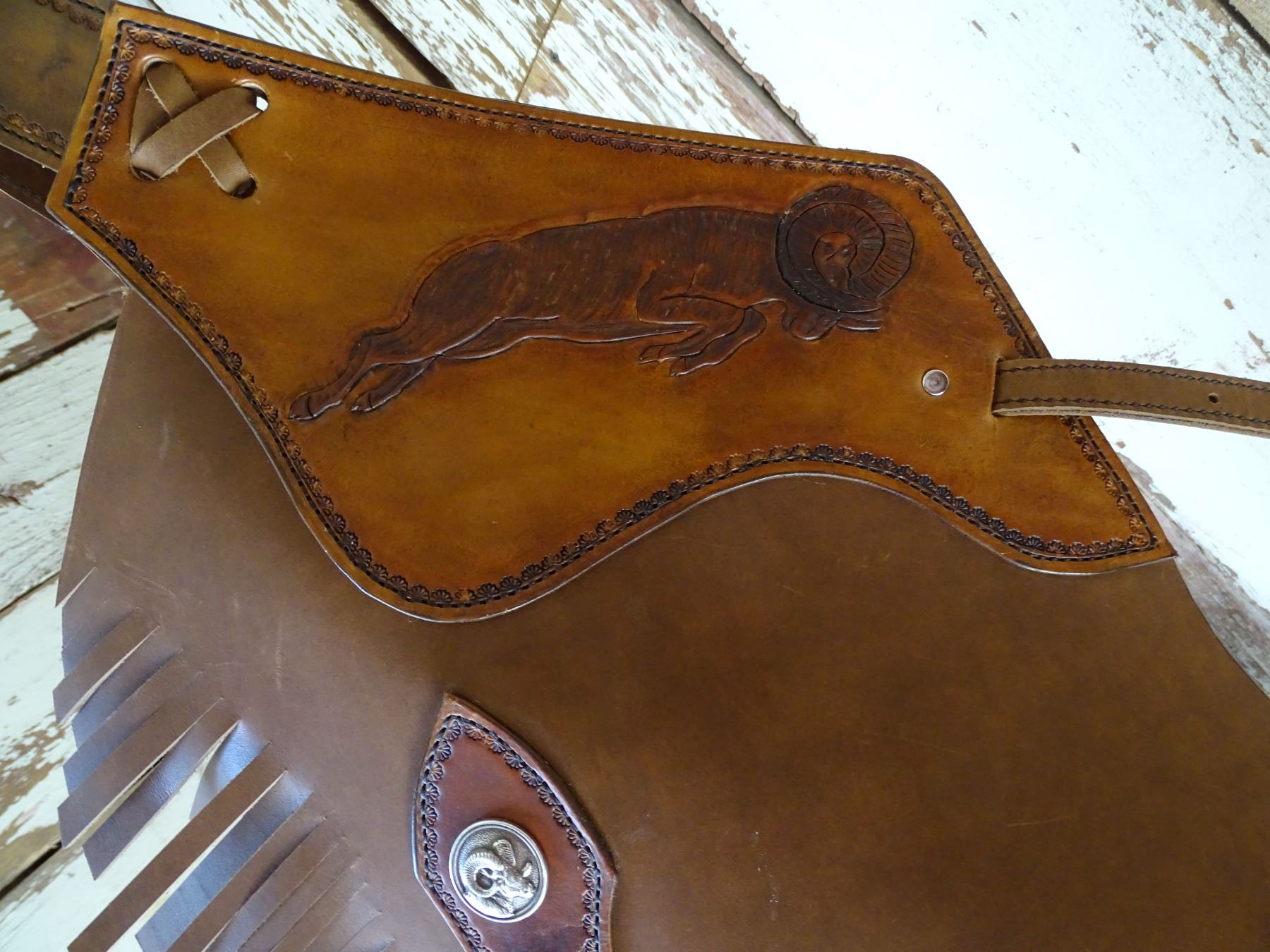Description: A set of custom handmade leather chinks. High quality leather with hand tooled images of bighorn sheep on yolks, with ram head conchos used throughout. Will fit various waist sizes and leg sizes with adjustable waist belt and leg straps.