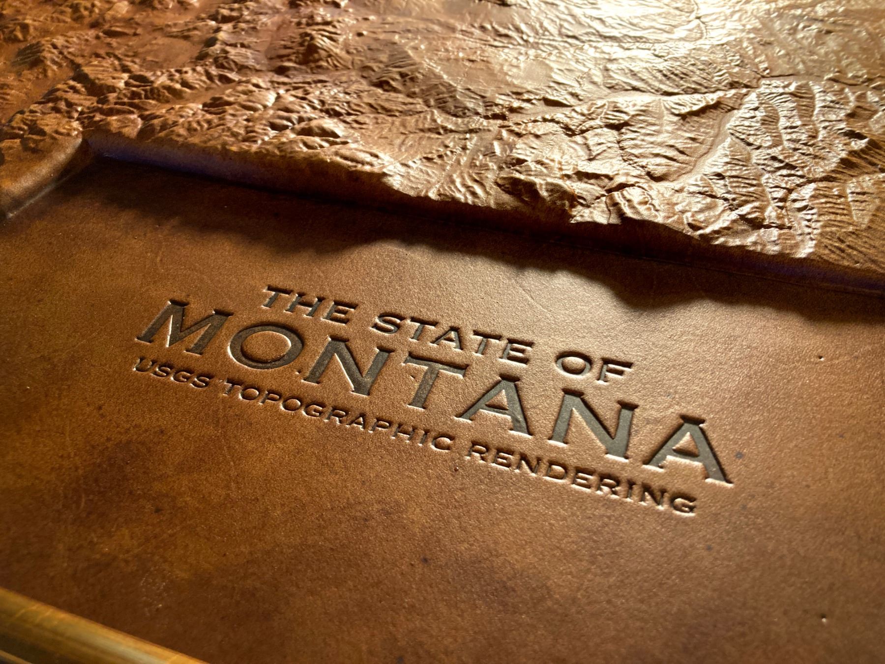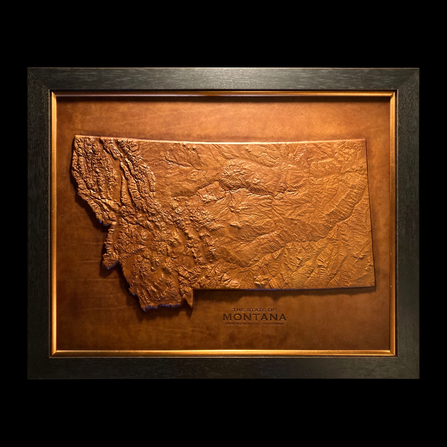 Winning bidder receives this stunning State of Montana, custom leather Topographic Map from Columbia Pressworks. Piece is 36"x28" Framed.